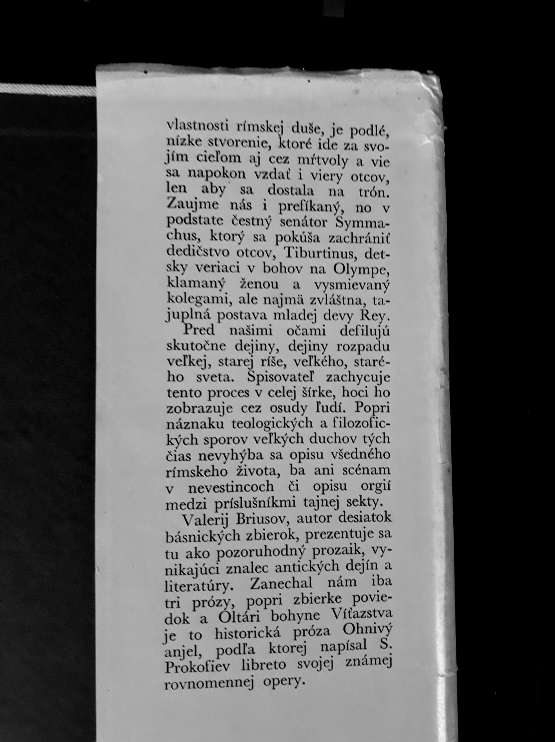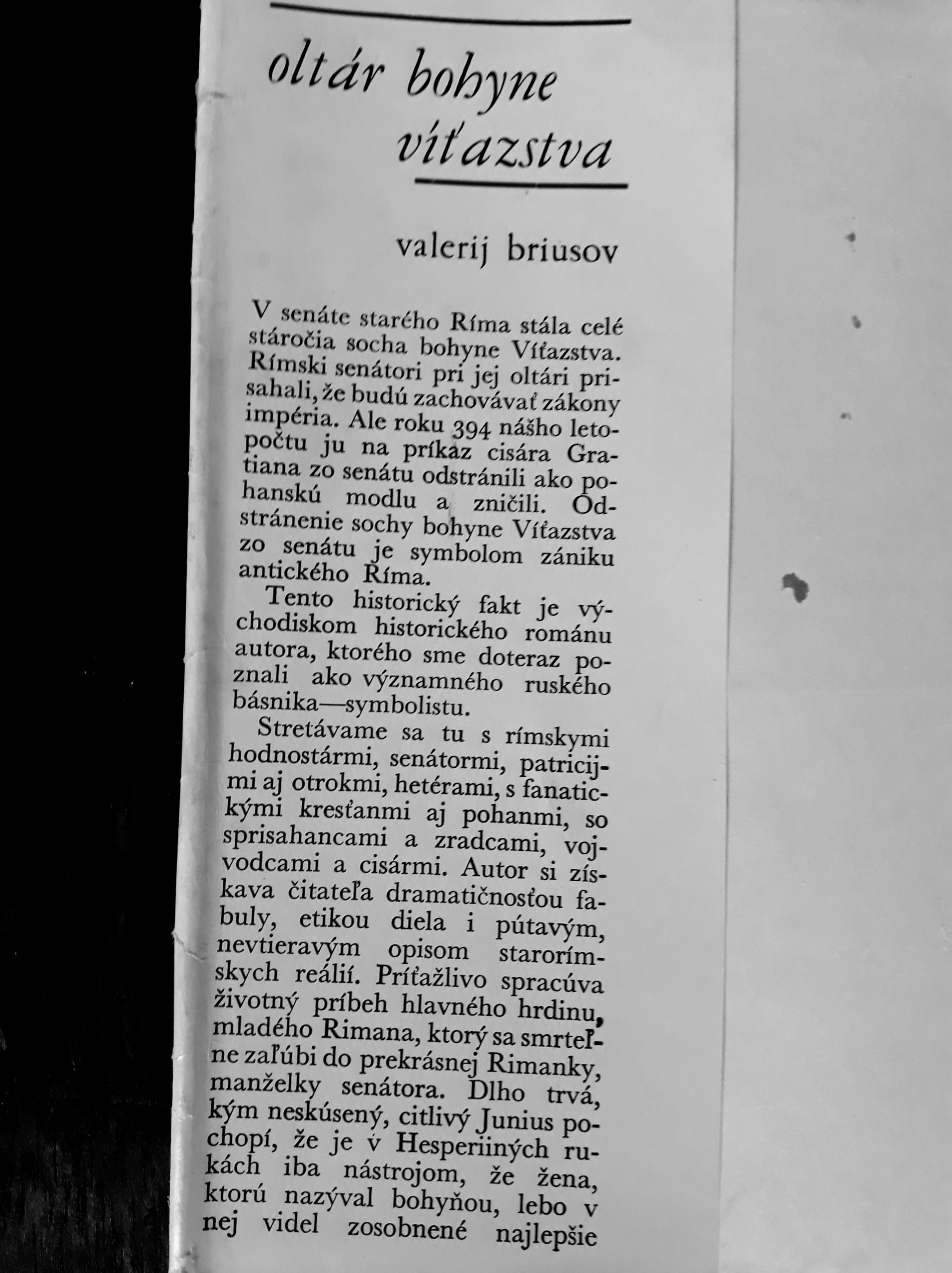 V senáte starého Ríma stála stáročia socha bohyne Víťazstva. Rímski senátori pri jej oltári prisahali, že budú zachovávať zákony impéria. Ale roku 394 ju na príkaz cisára Gratiana odstránili ako pohanskú modlu. Tento čin sa stal symbolom zániku antického Ríma a východiskom historického románu Valerija Briusova.