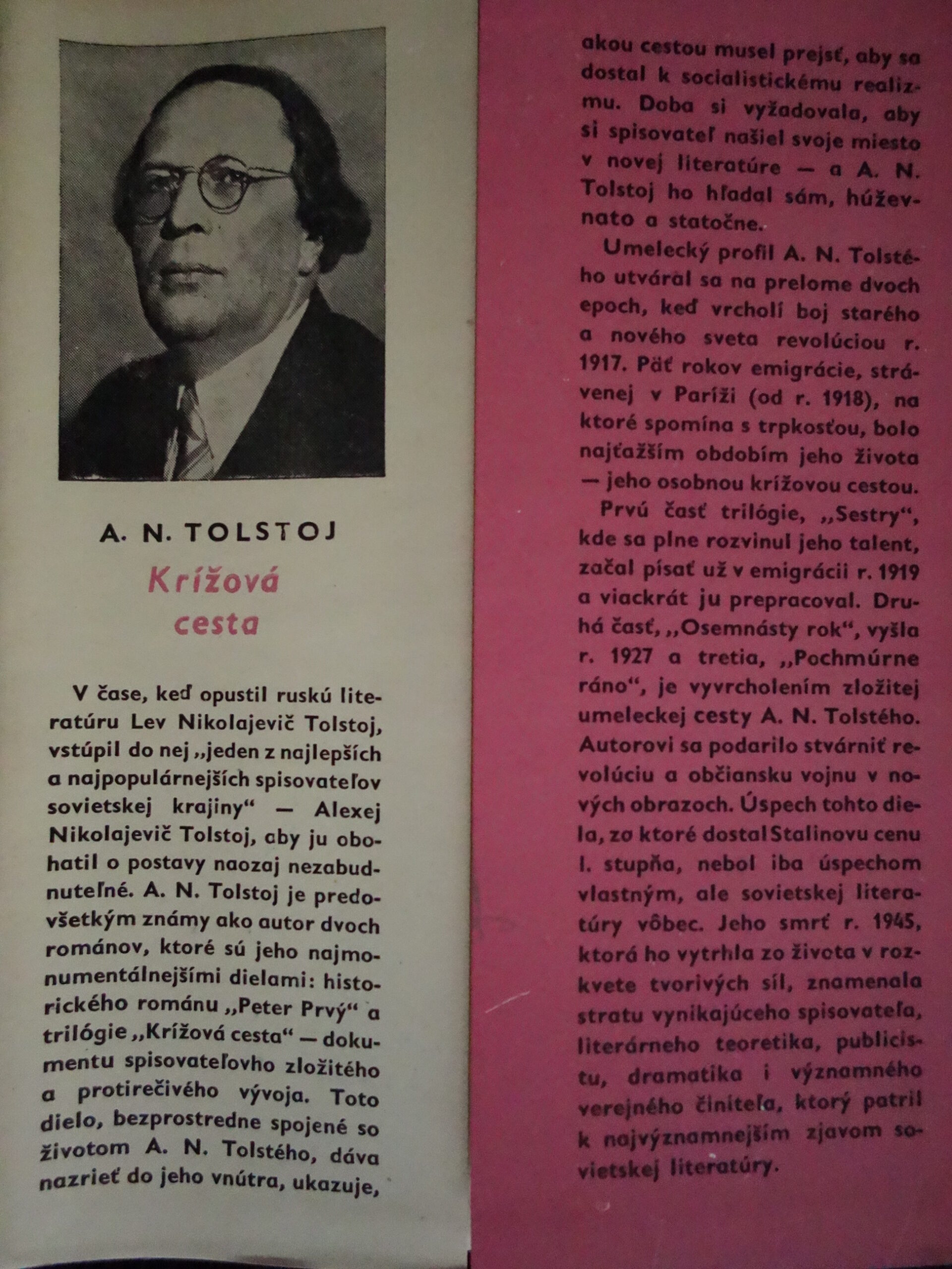 “Krížová cesta” patrí k vrcholným dielam vynikajúceho ruského spisovateľa A. Tolstého, ktorý ho napísal v rokoch 1921-1941. Popisuje, jak žilo a jak upadalo cárske Rusko, ako vznikalo socialistické Rusko. Všíma si život inteligencie v predrevolučnom Rusku, ovzdušie neistoty a nepokoja, v ktorom bujnejú vášne a neresti, rozkladajú sa mravné i kultúrne hodnoty, dostáva sa do slepej uličky umenie…..