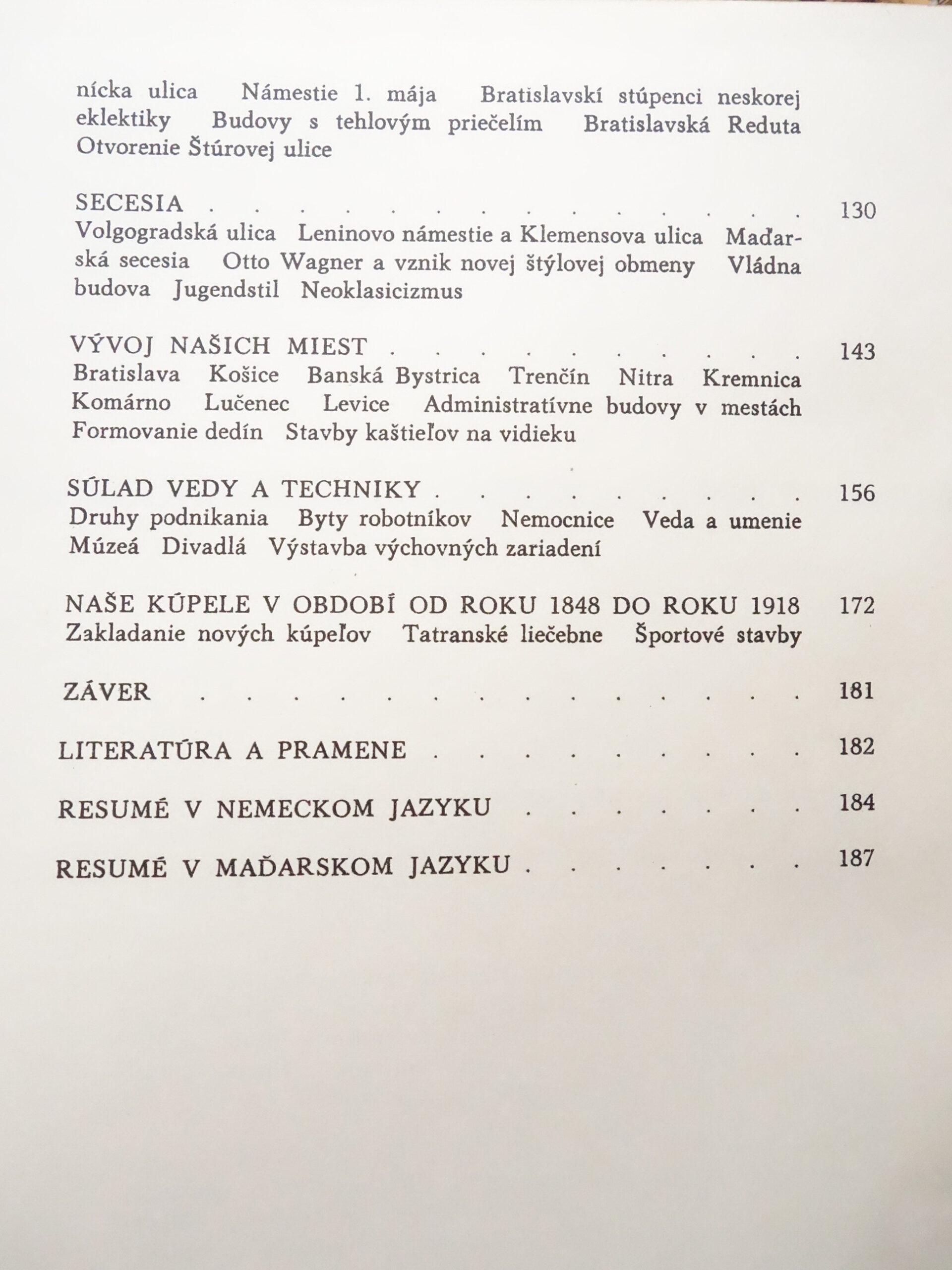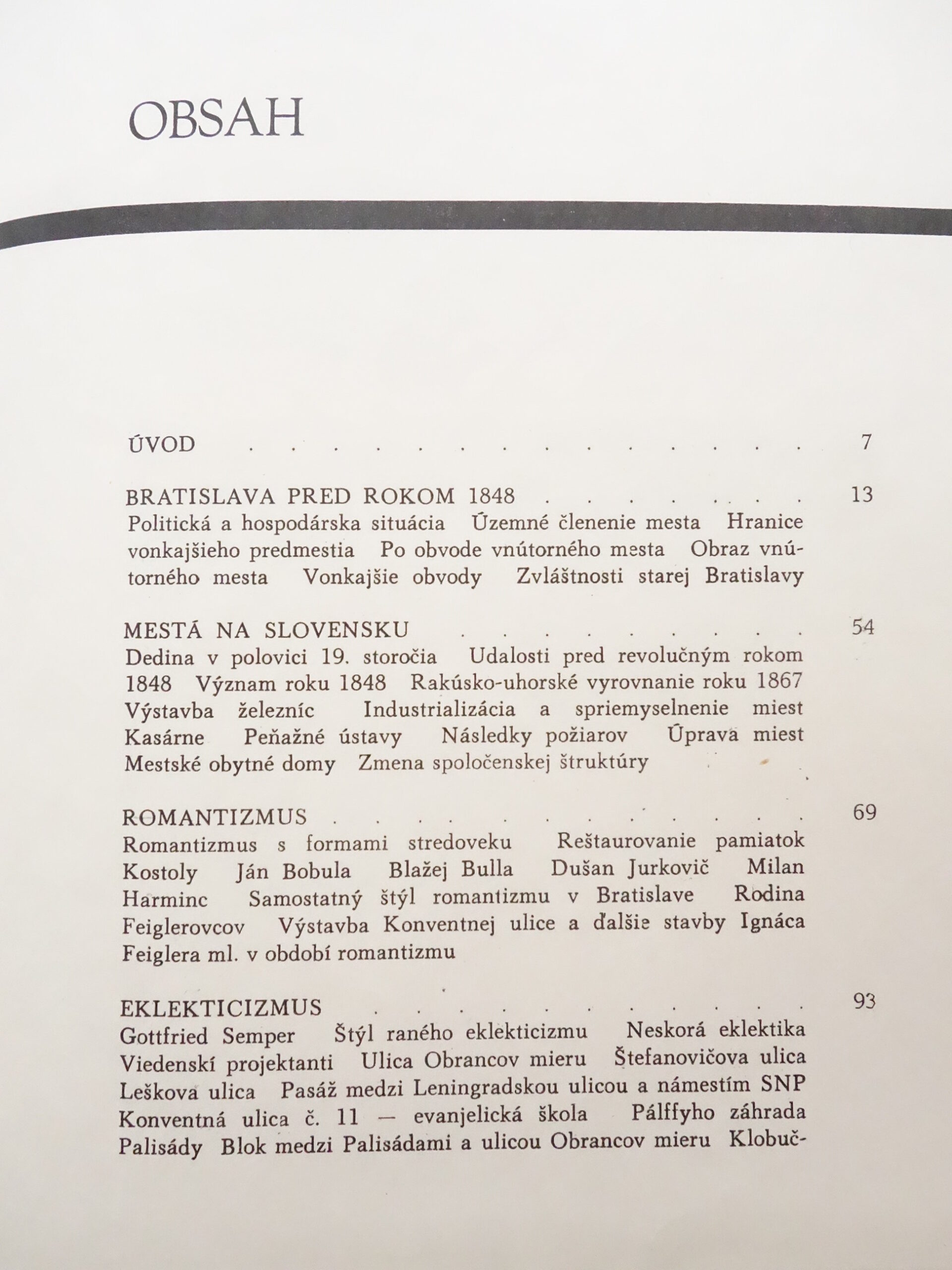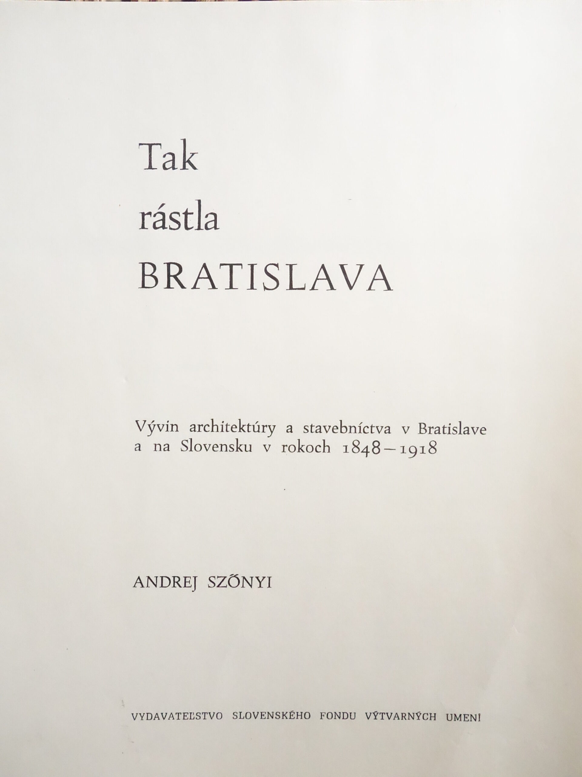 Kniha ponúka písmom i obrazom detailný pohľad na vývin architektúry a stavebníctva v Bratislave a na Slovensku v rokoch 1848 – 1918.