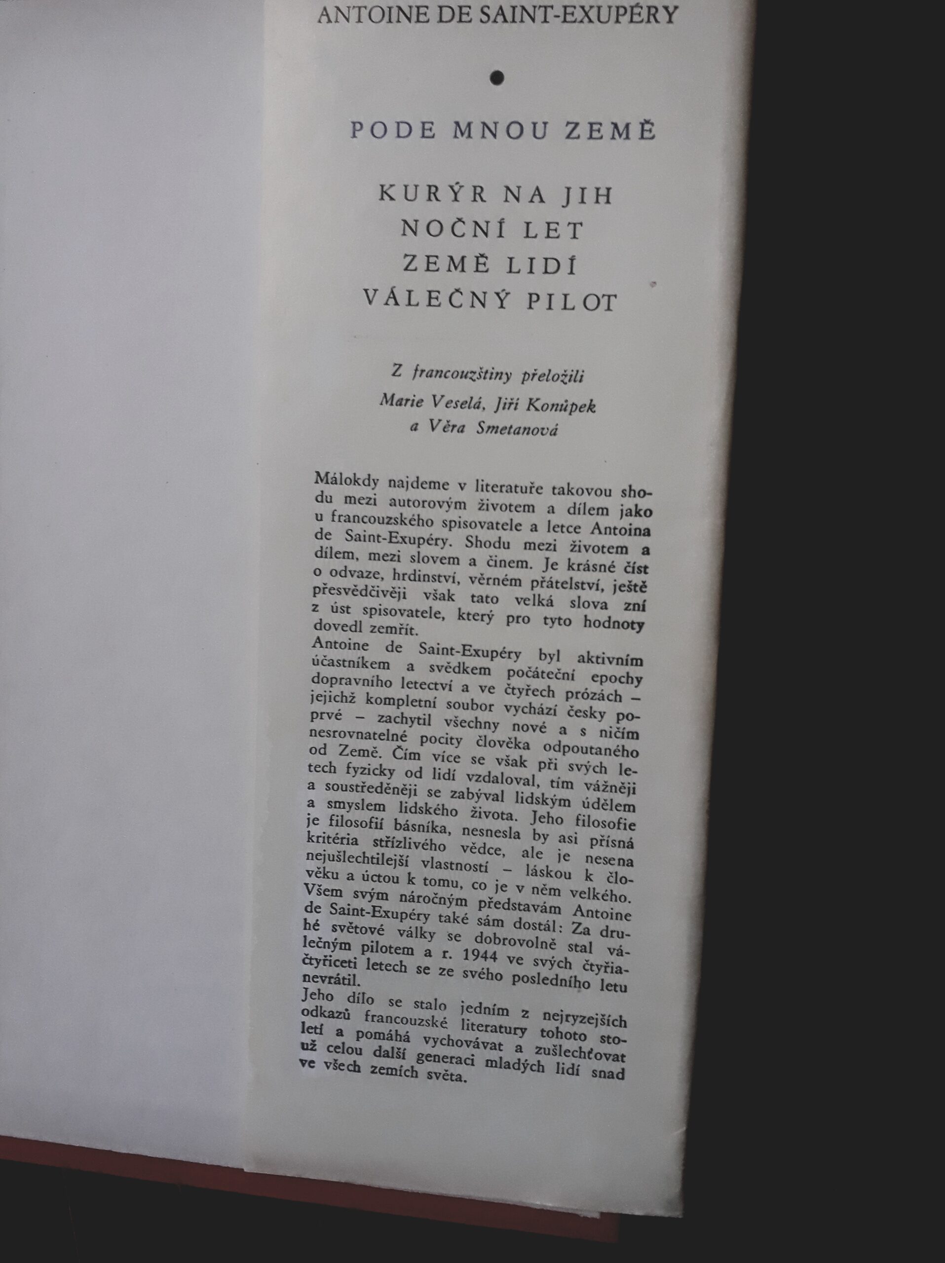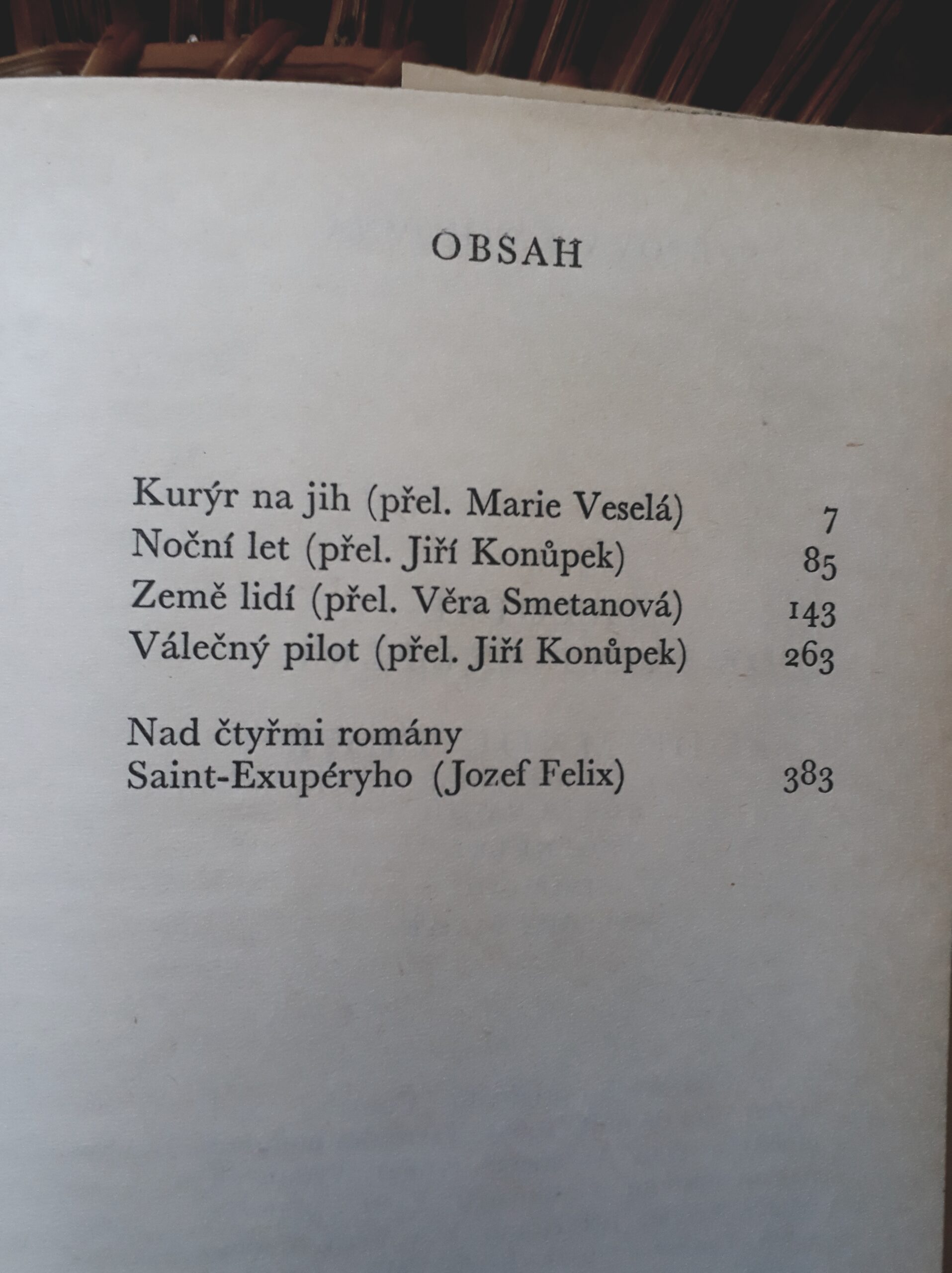 Čtyři romány francouzského spisovatele a letce, průkopníka prvních dopravních letů v době meziválečné a pozdějšího hrdinného letce druhé světové války, zachycují všechny nové pocity člověka, který se odpoutal od zemskéhopovrchu. Jsou to příběhy o odvaze, hrdinství a věrném přátelství, v nichž je dosti místa k zamyšlení nad lidským údělem a smyslem lidského života, přičemž autorova filosofie se zde dobírá lásky k člověku a úcty k tomu, co je vněm velikého.