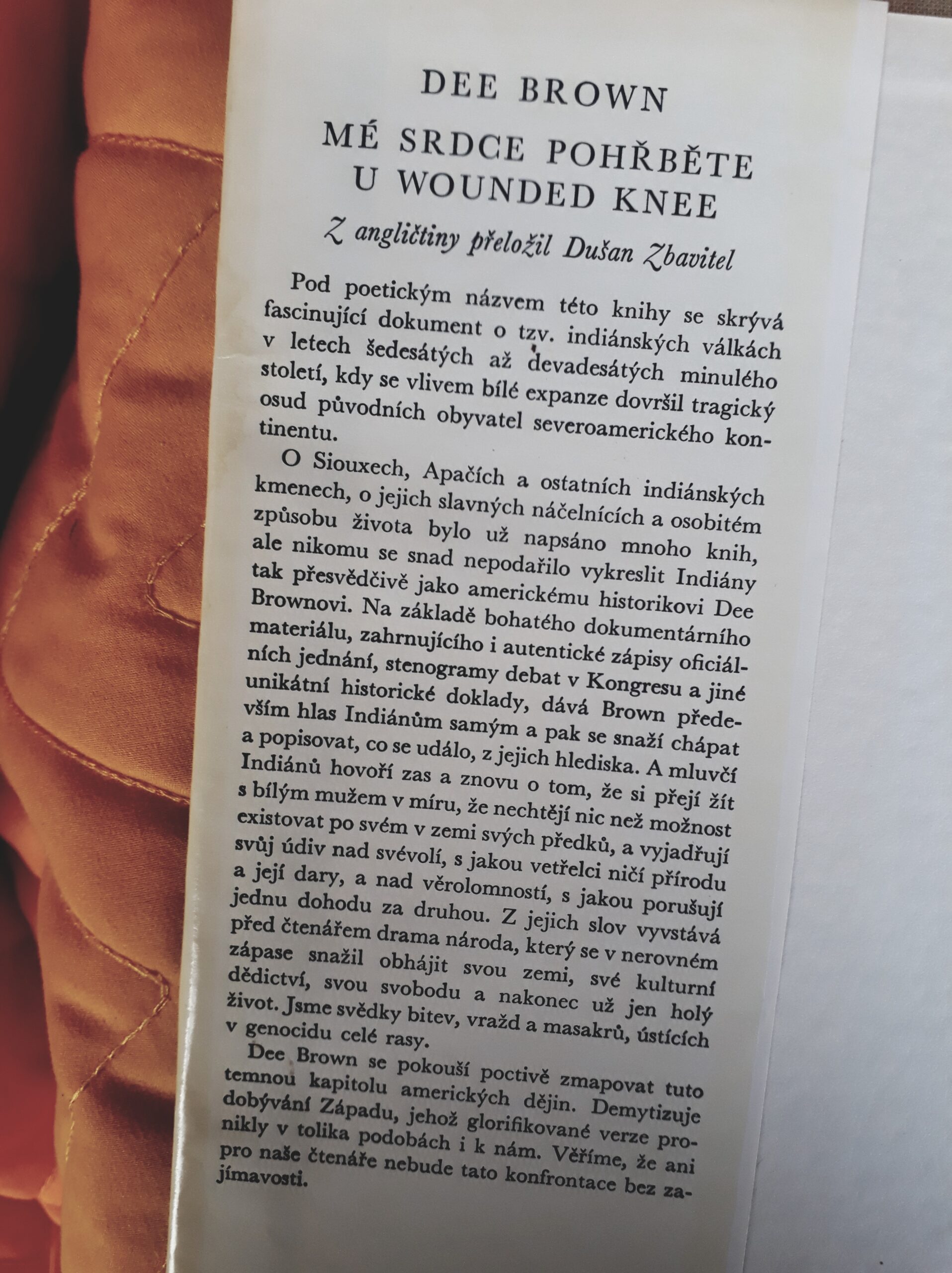 Fascinující dokument o tzv. indiánských válkách v letech šedesátých až devadesátých minulého století, během nichž se dovršil tragický osud původního obyvatelstva severoamerického kontinentu. Na základě bohatého materiálu, zahrnujícího jak autentické zápisy oficiálních jednání, tak i stenogramy debat v Kongresu a jiné málo známé historické doklady, dává Dee Brown především hlas Indiánům samotným.