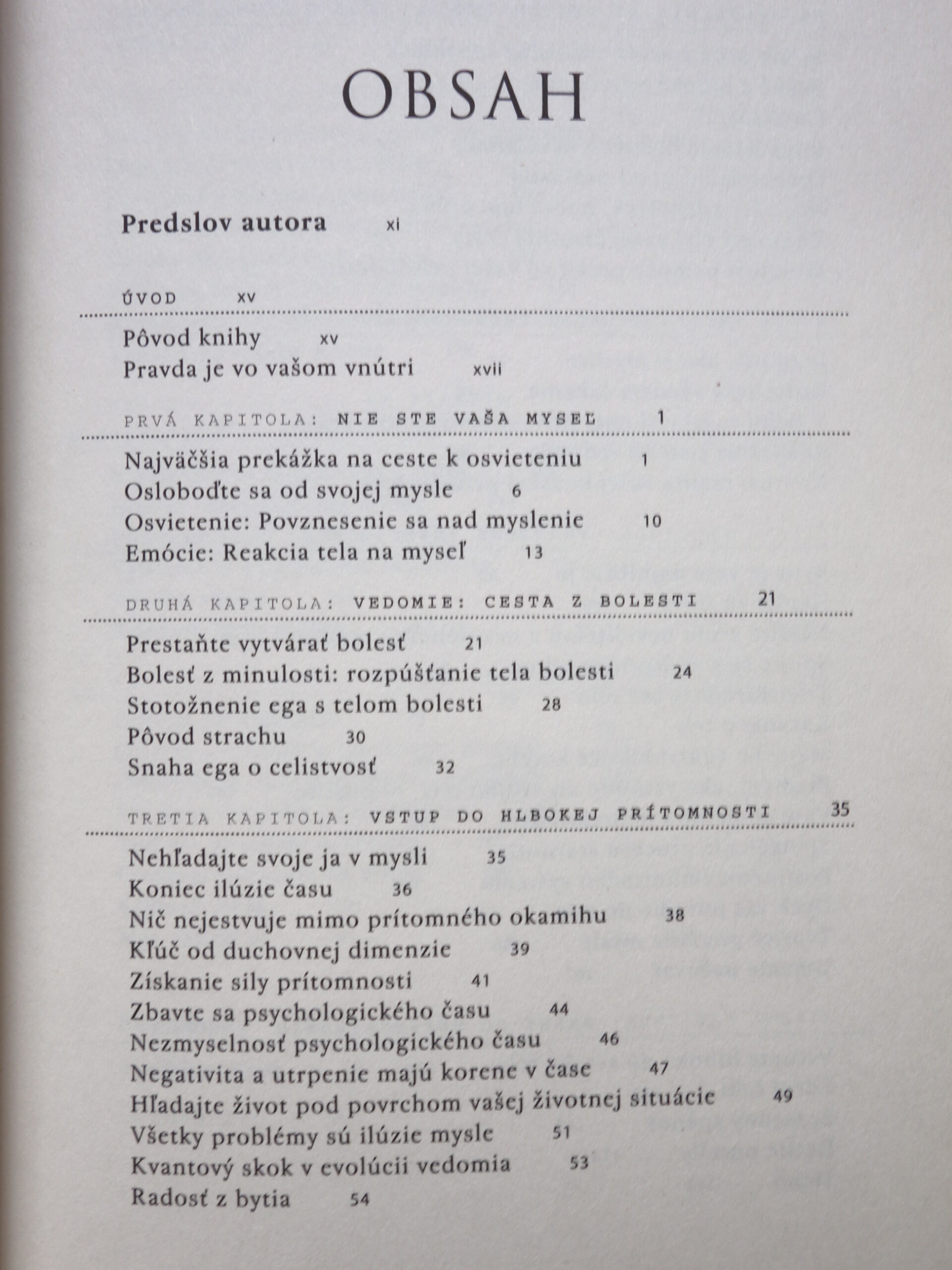 Tolle nás vo svojej knihe pozýva, aby sme nastúpili na cestu duchovného osvietenia, tým, že sa vzdáme nášho falošného ja, ktoré je produktom našej mysle a nájdeme svoje skutočné ja a hlbokú vnútornú radosť v prítomnom okamžiku. Takým spôsobom sa môžeme stať viac milujúcimi a vytvárať skutočné spojenia medzi naším skutočným ja a druhými ľuďmi.