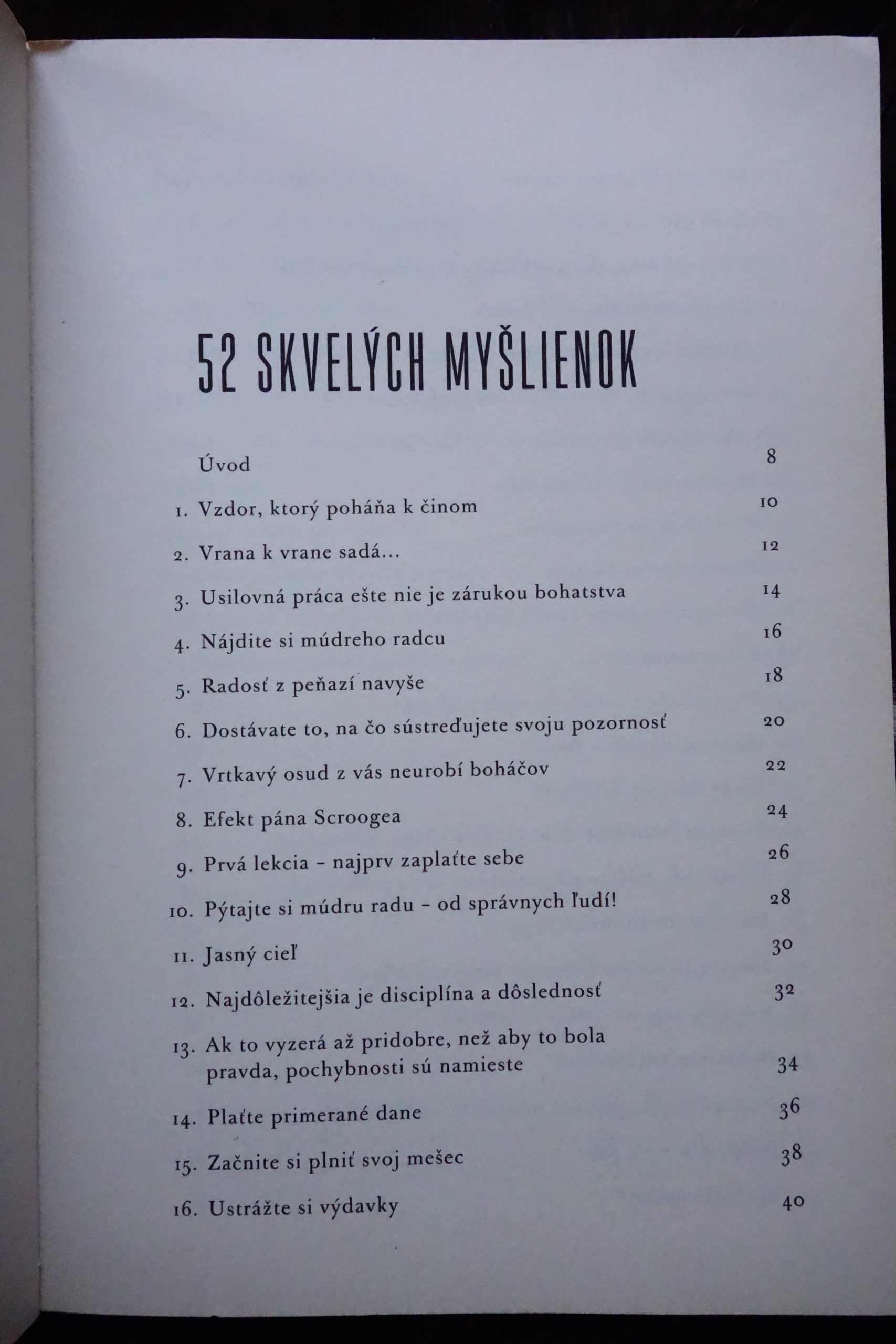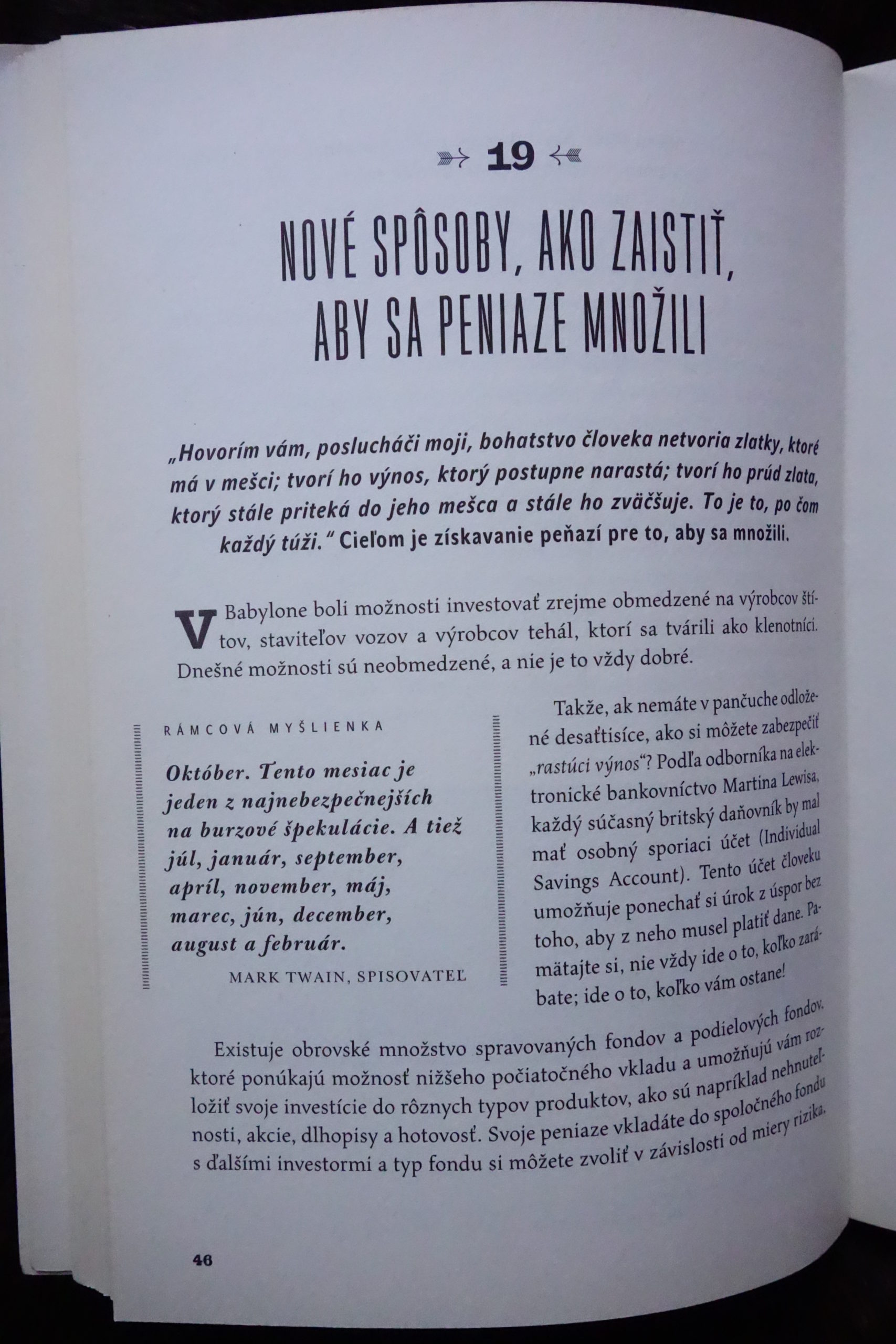 Dozviete sa v nej ako si vytvoriť príležitosť na investovanie, ako vyvážiť mieru rizika zisku, aké kroky podniknúť v prípade nepriaznivej finančnej situácie, ako rozlíšiť dobrý od zlého dlhu a pod.