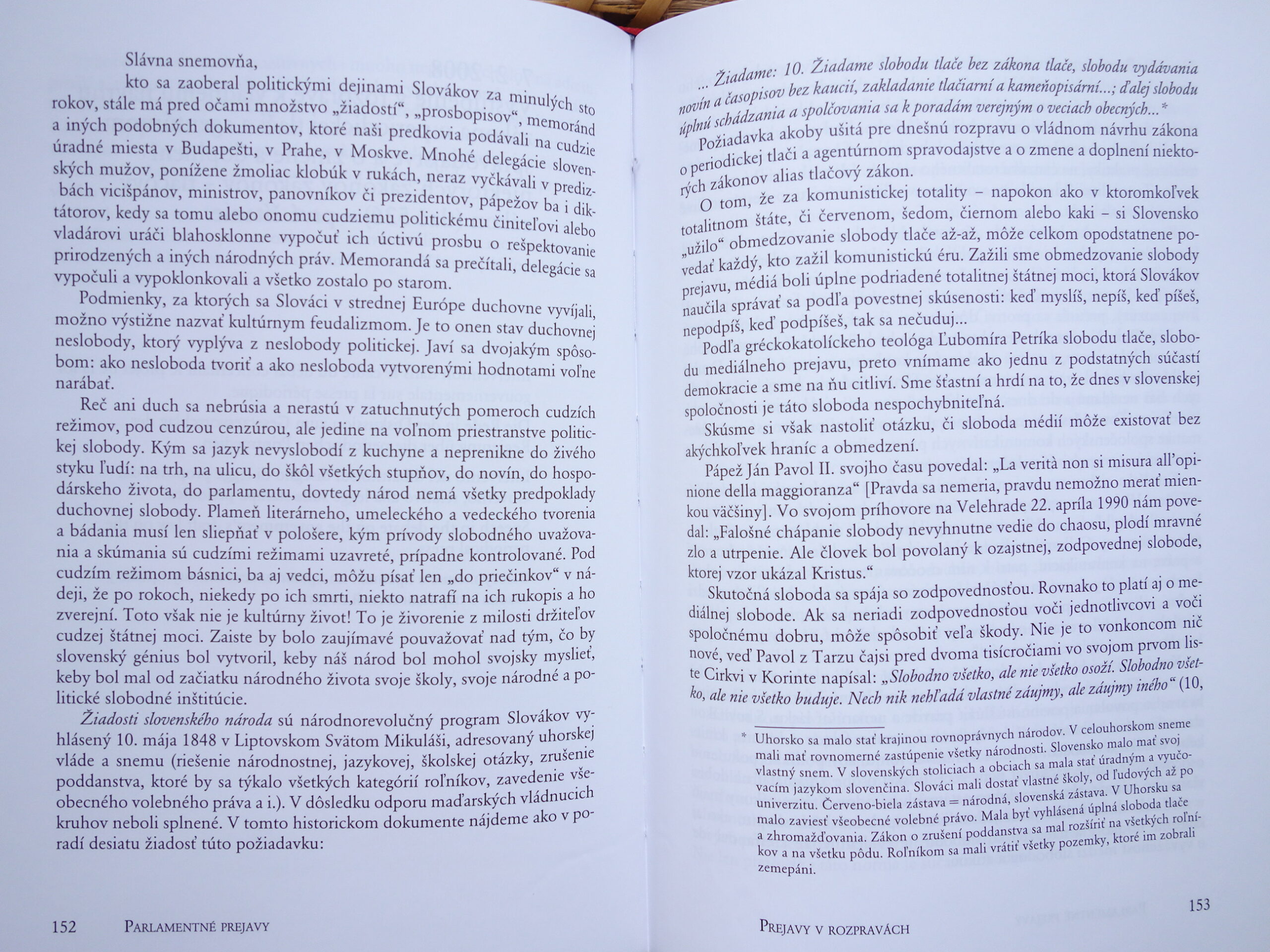 Z obsahu: Úvodné texty (23 – 46), Prejavy v rozpravách (47 – 337), Príloha – Vybrané dokumenty: Návrhy zákonov predložené na rokovanie NR SR (338 – 385), Deklarácie a vyhlásenia (386 – 399), Interpelácie (400 – 429), Príležitostné prejavy a rozhovory a ďalšie