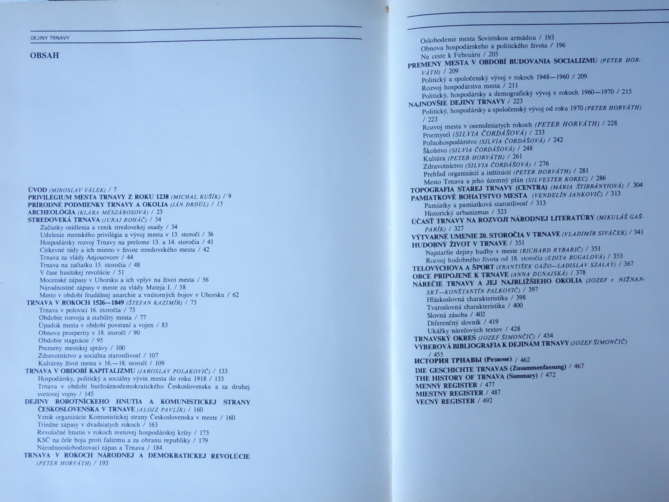 Kolektív historikov v spolupráci s odborníkmi z ďalších vedných disciplín predkladá obraz historického vývinu Trnavy zarámovaný prírodným prostredím mesta, zakotvený v hospodárskych pomeroch mesta a pestrý bohatstvom prejavov spoločenského a kultúrneho života mestskej pospolitosti v jednotlivých historických obdobiach.
