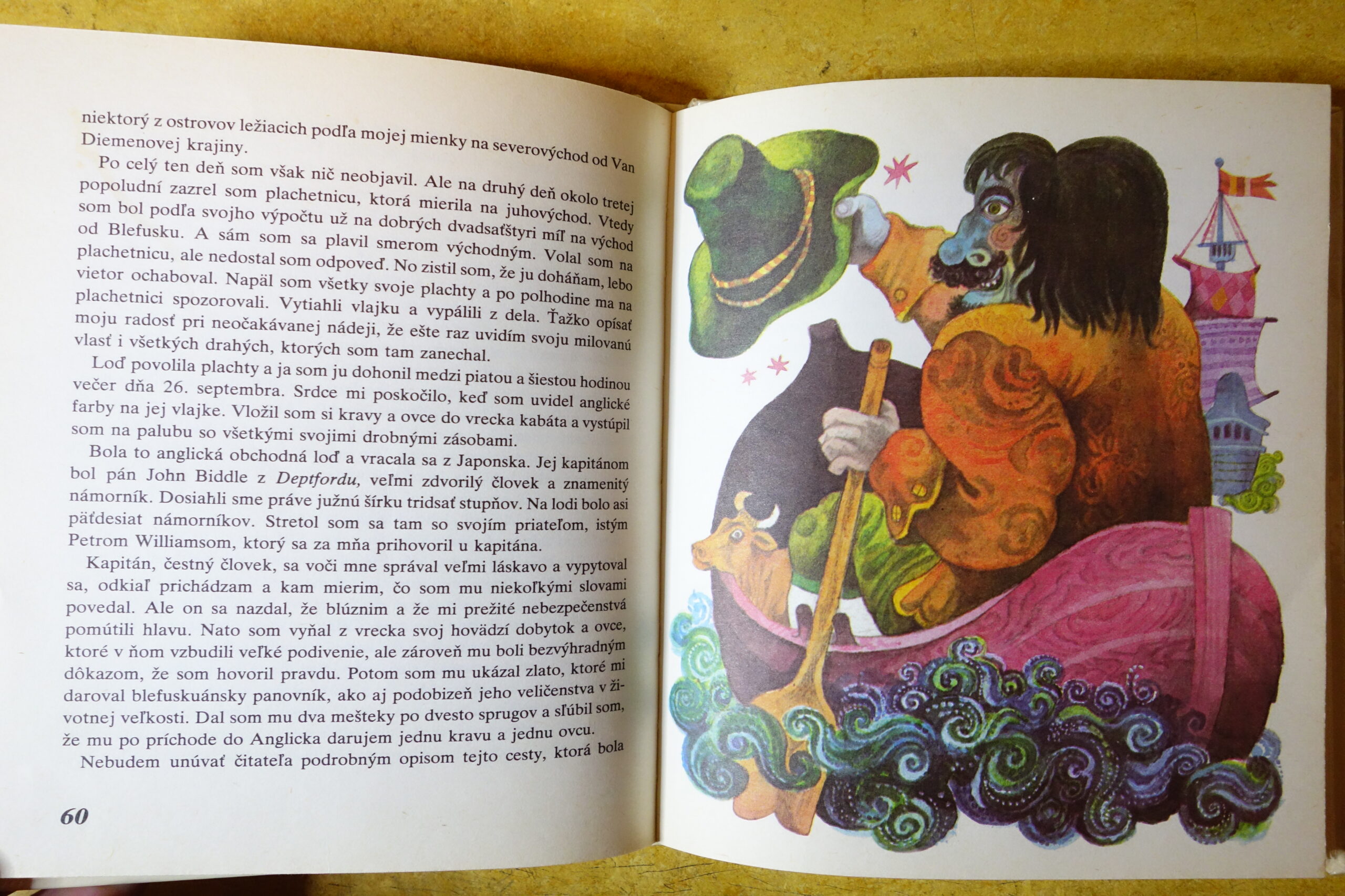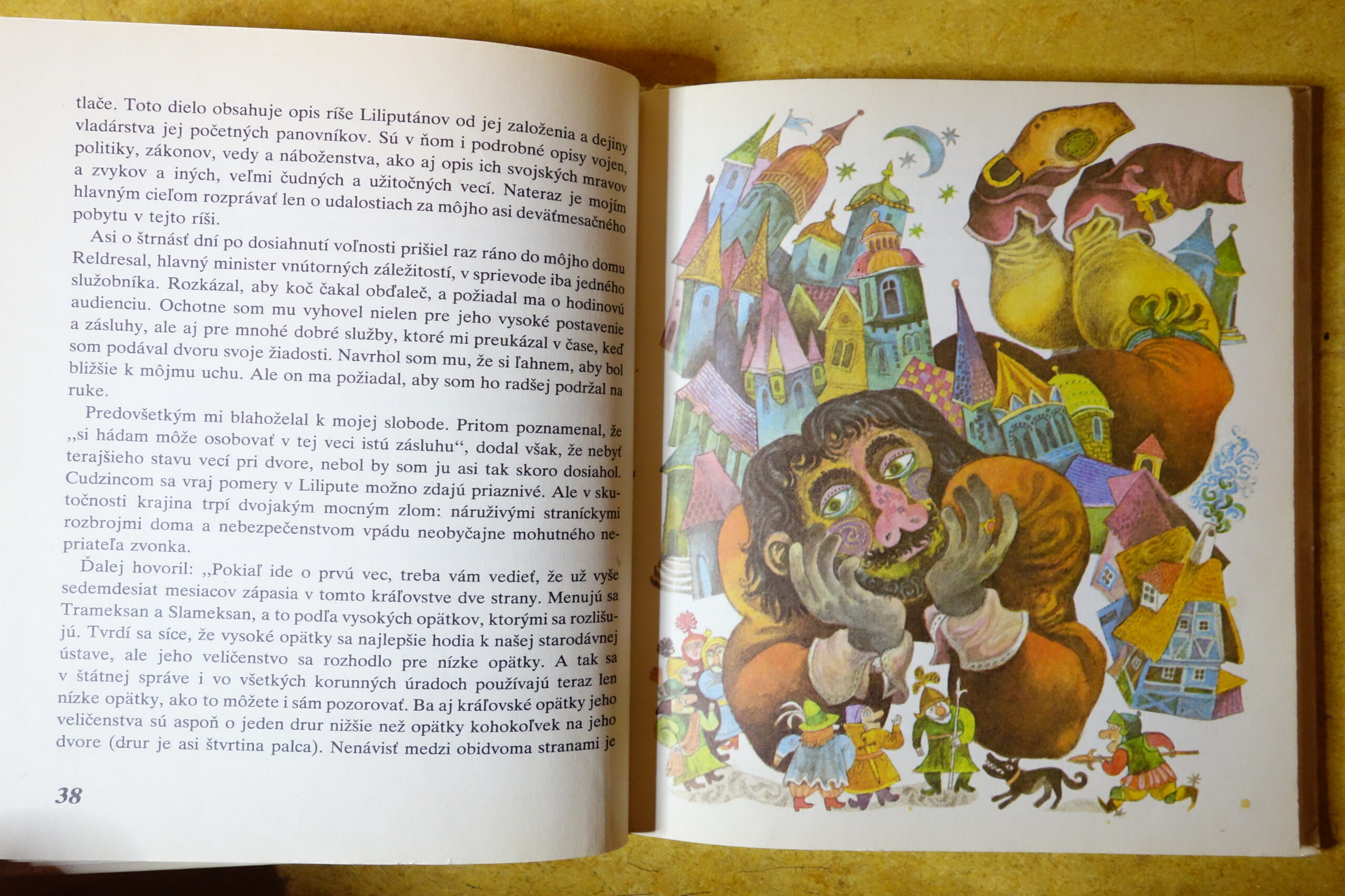 Rozpráva o dobrodružných cestách Gullivera najskôr do rozprávkového sveta miniľudí Liliputu, do krajiny obrov Brobdingnagu, na lietajúci ostrov Laputu a napokon do krajiny Hujhnhnmov, kde zvieratá vystupujú ako rozumné bytosti a ľudia poklesli na úroveň hoviad.