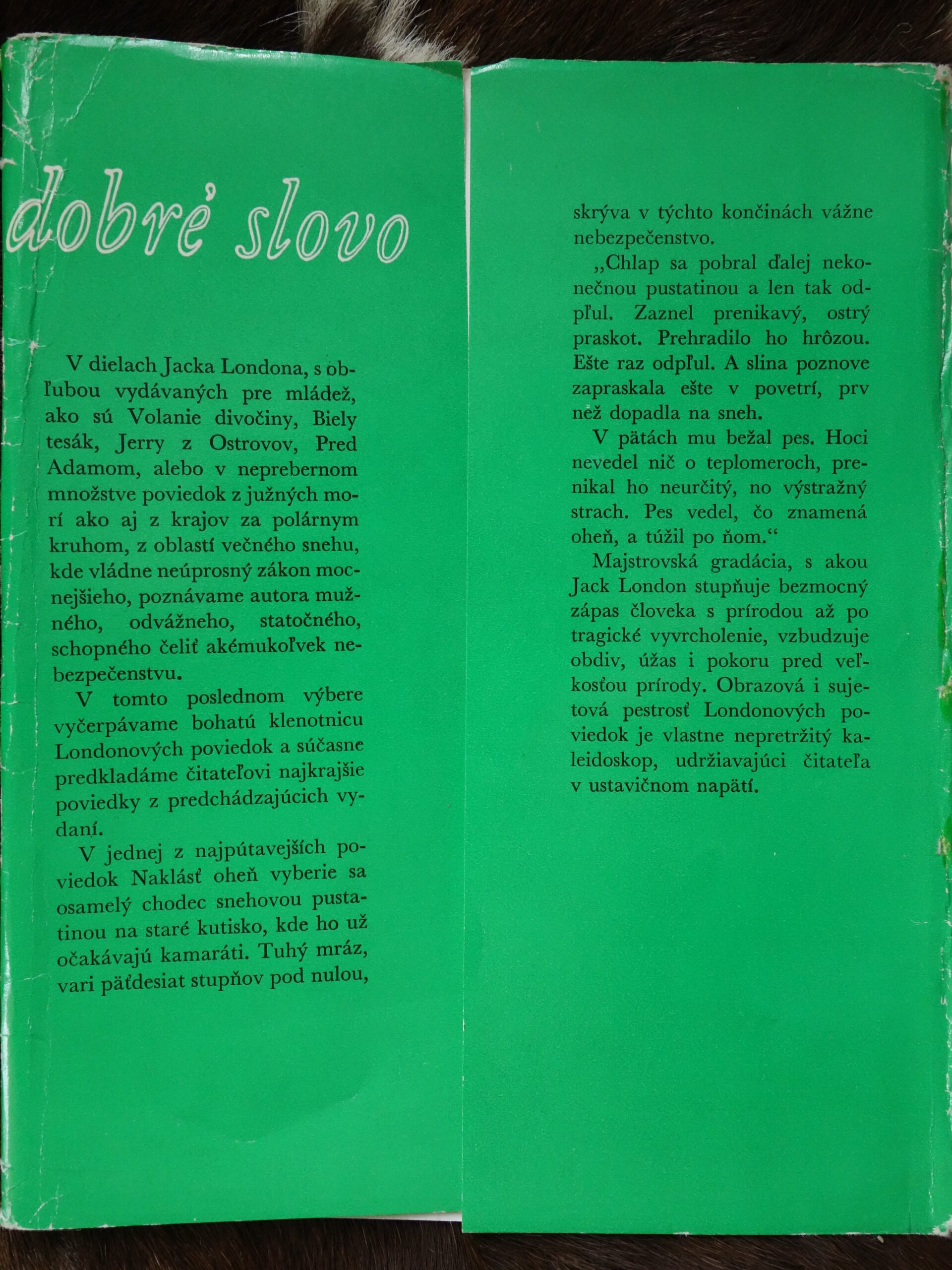 V jednej z najpútavejších poviedok Naklásť oheň vyberie sa osamelý chodec snehovou pustatinou na staré kutisko, kde ho už očakávajú kamaráti. Tuhý mráz, vari päťdesiat stupňov pod nulou, skrýva v týchto končinách vážne nebezpečenstvo. Majstrovská gradácia, s akou Jack London stupňuje bezmocný zápas človeka s prírodou až po tragické vyvrcholenie, vzbudzuje obdiv, úžas i pokoru pred veľkosťou prírody.
