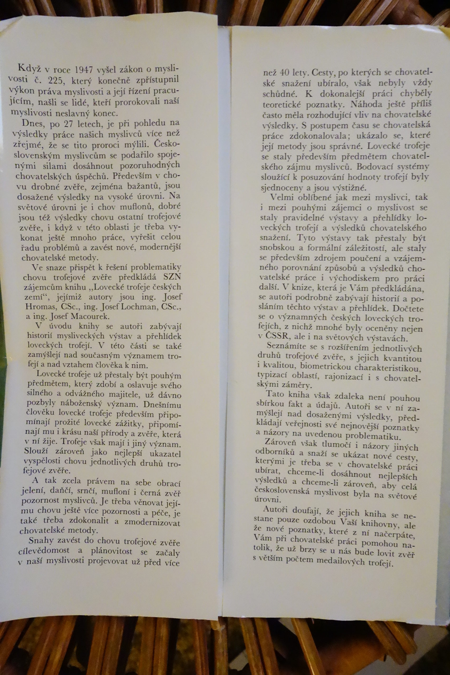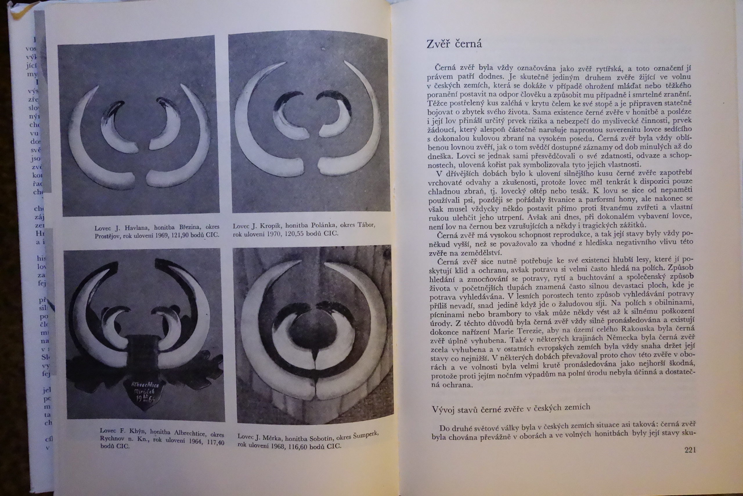 “Po stručnej histórii loveckých a lesníckych výstav od začiatku ich konania až do r. 1971 autori uvádzajú systematiku českej lovnej zvery a jej rozšírenie vo svete. Jadro práce tvoria informácie o jednotlivých druhoch trofejovej zvery (jeleň, daniel, sika, srnec, jelenec, muflón, kamzík, koza bezoárová, diviak), ich rozšírenie, početnosť, oblastiach chovu, bodovaní ich trofejí, chovateľských opatreniach atď.“