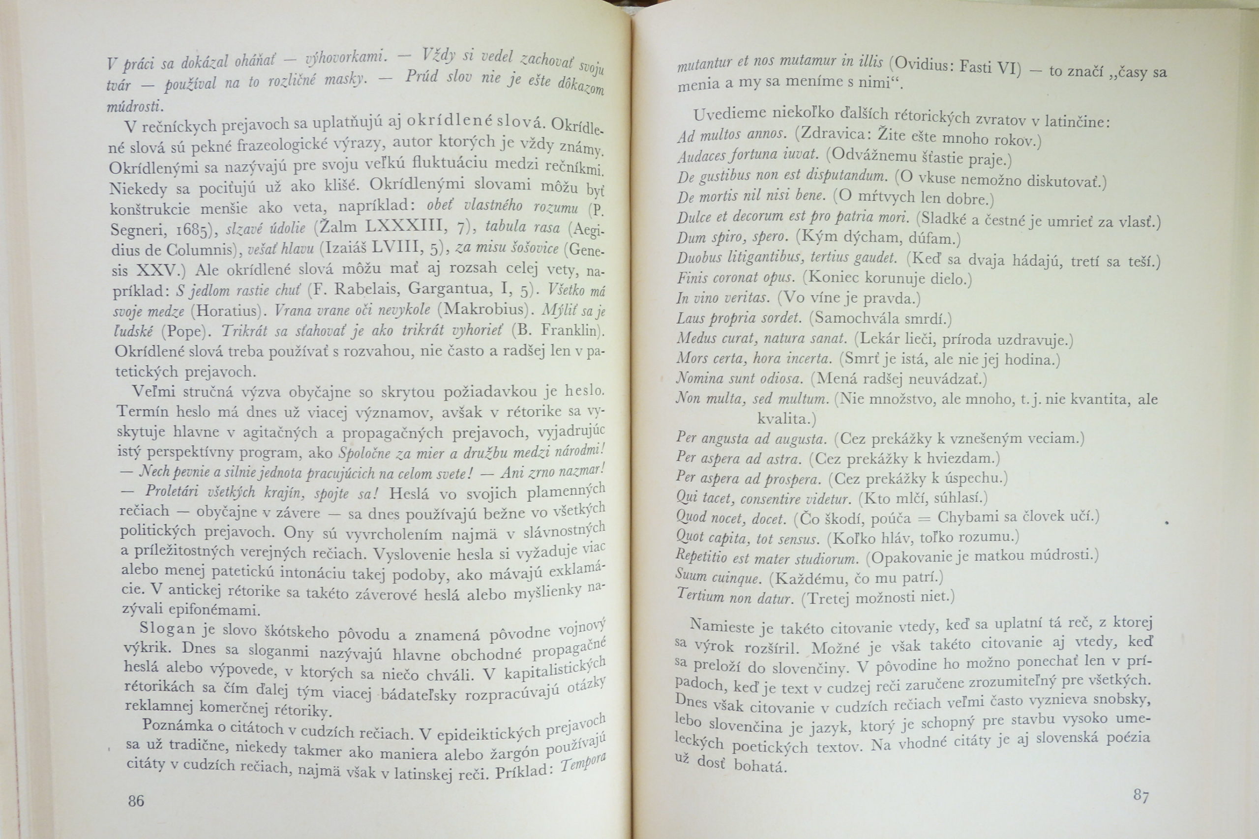 “Prvá časť knihy sa zaoberá dejinamy rétoriky od najstarších čias podnes. Potom sa stručne preberajú základy semiotiky. Jadrom práce je rozbor jazykových a mimojazykových prostriedkov rečníka. V tejto časti sa venuje pozornosť najskôr jazykovým prostriedkom (rečníckym figúram). Nasledujú kapitoly venované zvukovej a pohybovej zložke rečníckych prejavov. Knihu uzatvára poučenie o súčasných rečníckych žánroch.“