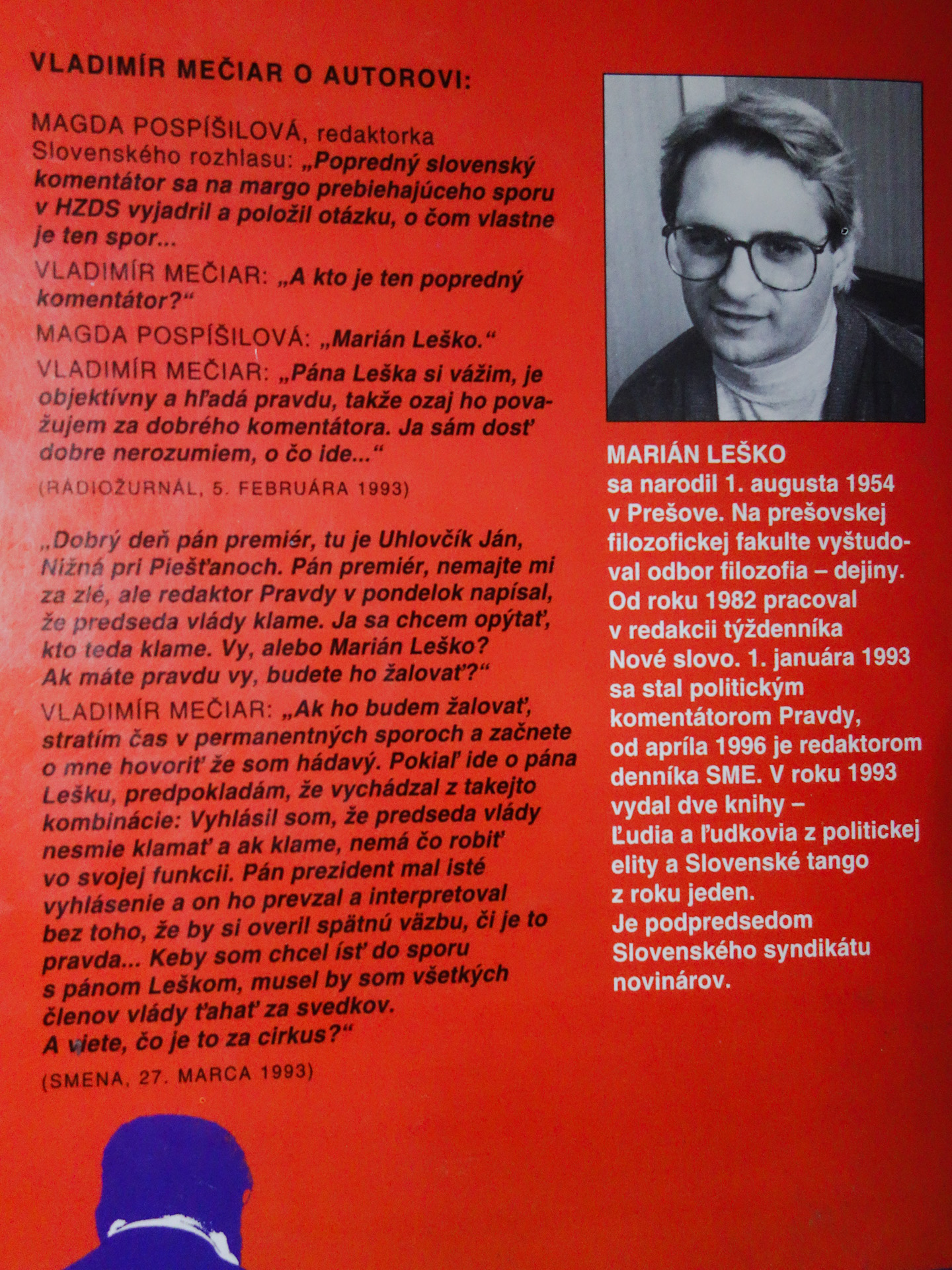 Politik bez škrupúľ, politika bez zábran, v podaní bývalého komunistického propagandistu, ktorý kádroval za minulého režimu a vynáša súdy aj v tomto… V prvej časti knihy autor opisuje politickú biografiu premiéra V. Mečiara od novembra 1989. V druhej časti sa zaoberá tým, čomu sa v poslednom čase hovorí mečiarizmus.