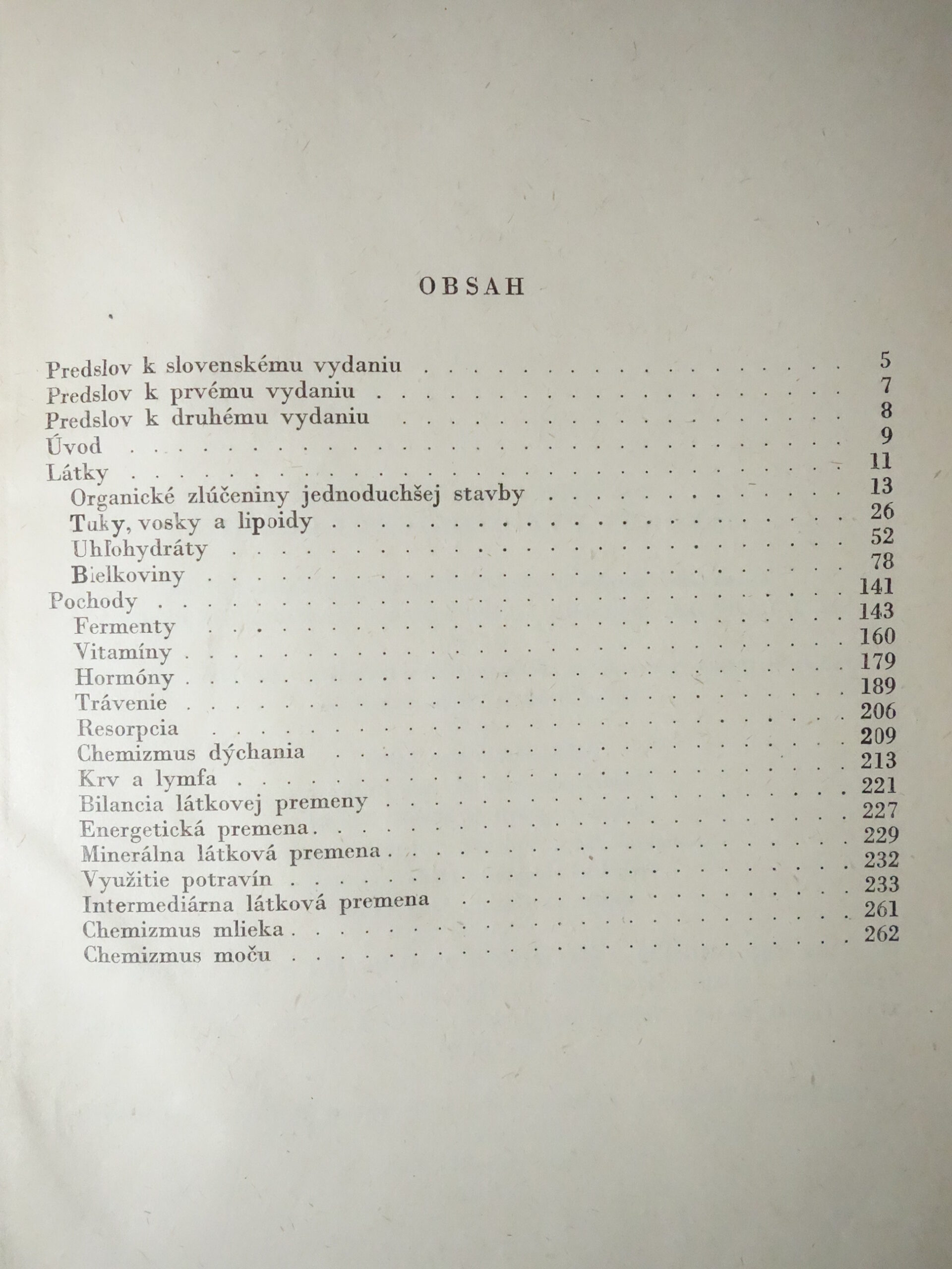 Rozoberá biochemické pochody v organizmoch domácich zvierat. Prvá časť hovorí o látkach nachádzajúcich sa v organizme zvierat a zaoberá sa deskriptívnou biológiou pričom na prvé miesto umiestňuje kapitolu o organických zlúčeninách jednoduchej stavby. Druhá časť zahrňuje problematiku dynamickej biochémie u jednotlivých domácich zvierat a porovnáva ju s biochemickými ukazovateľmi u človeka.