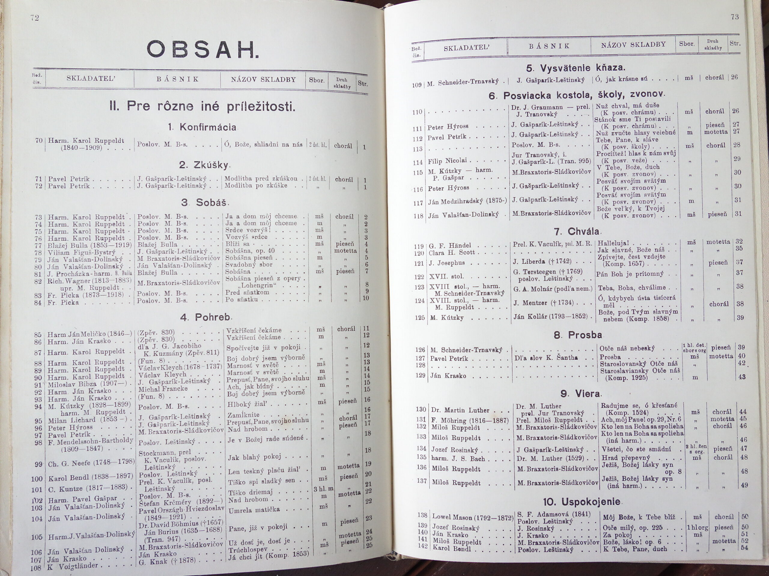 Konfirmácie,    Zkúšky,   Sobáš,    Pohreb,    Vysvätenie kňaza,   Posviacka kostola, školy, zvonov,    Chvála,    Prosba,   Viera,  Uspokojenie,   Národ, vlasť,    Žalmy,   Iné skladby…..