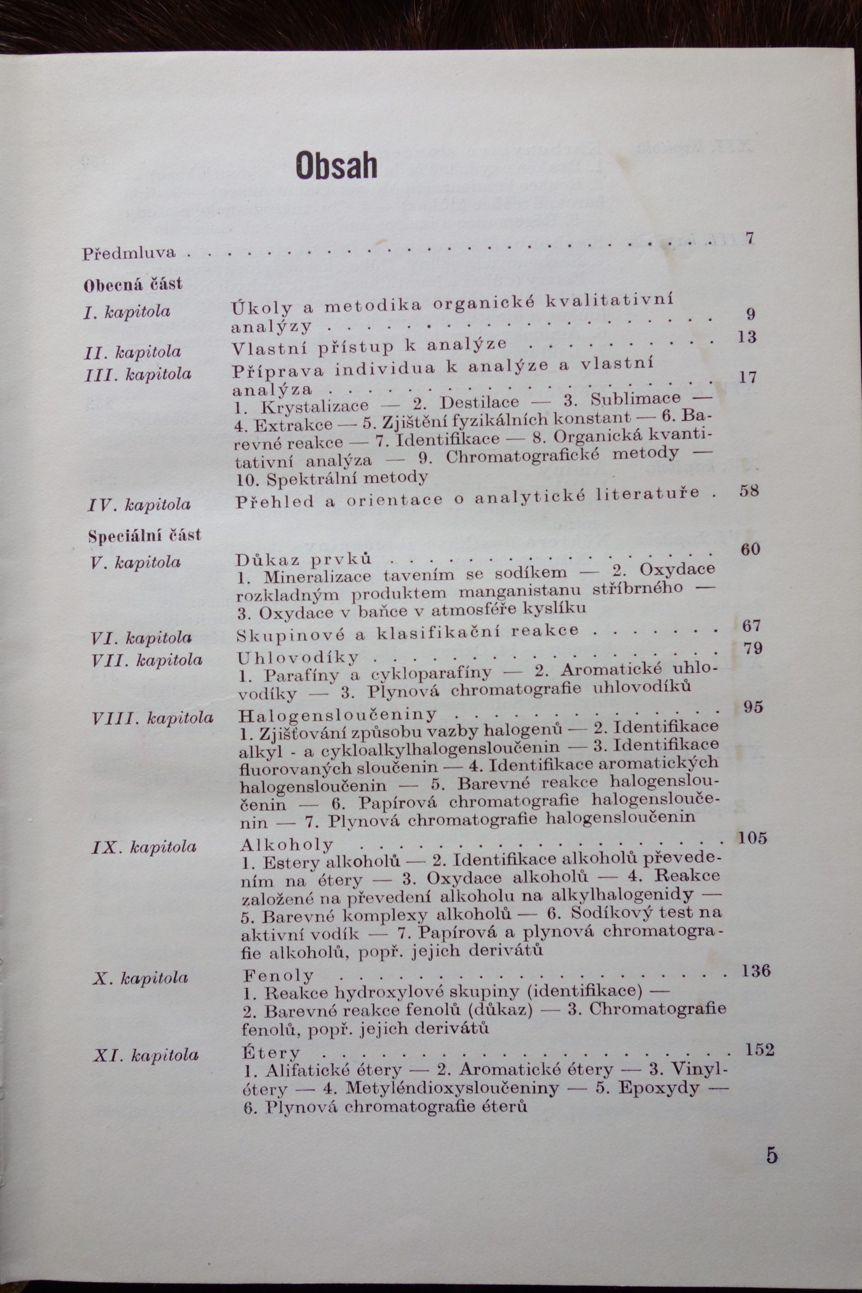 Vo všeobecnej časti sú popísané úlohy a metódy organickej kvalitatívnej analýzy, overené v priemyselnej a výskumnej praxi. Špeciálna časť objasňuje postupy, ktoré identifikujú a dokazujú jednotlivé triedy zlúčenín.