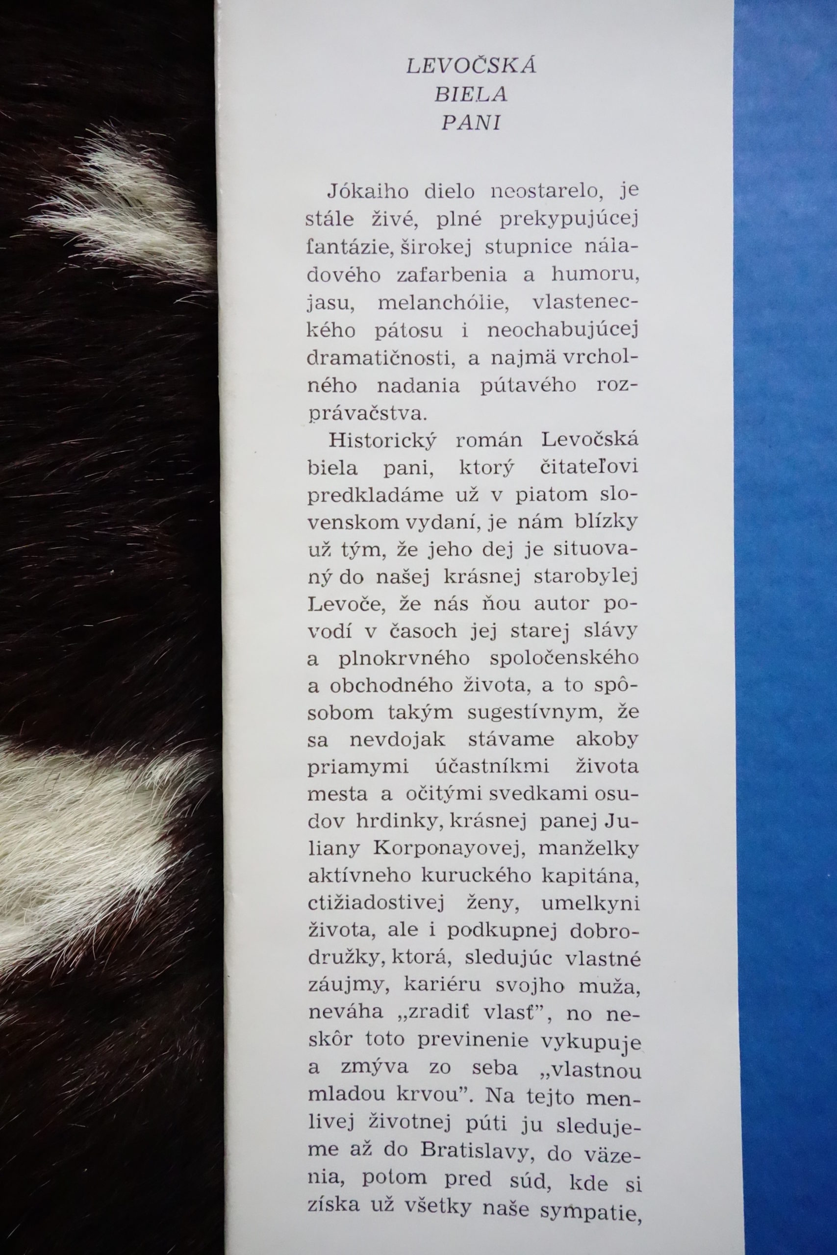 Jókaiho dielo “Levočská biela pani“ je stále živé, prekypujúce fantáziou, humorom, vlastenectvom, ale i dramatickosťou Jeho brilantné spracovanie a autorova všestrannosť oprávňujú zaradiť knihu medzi vrcholné diela popredných svetových klasikov.