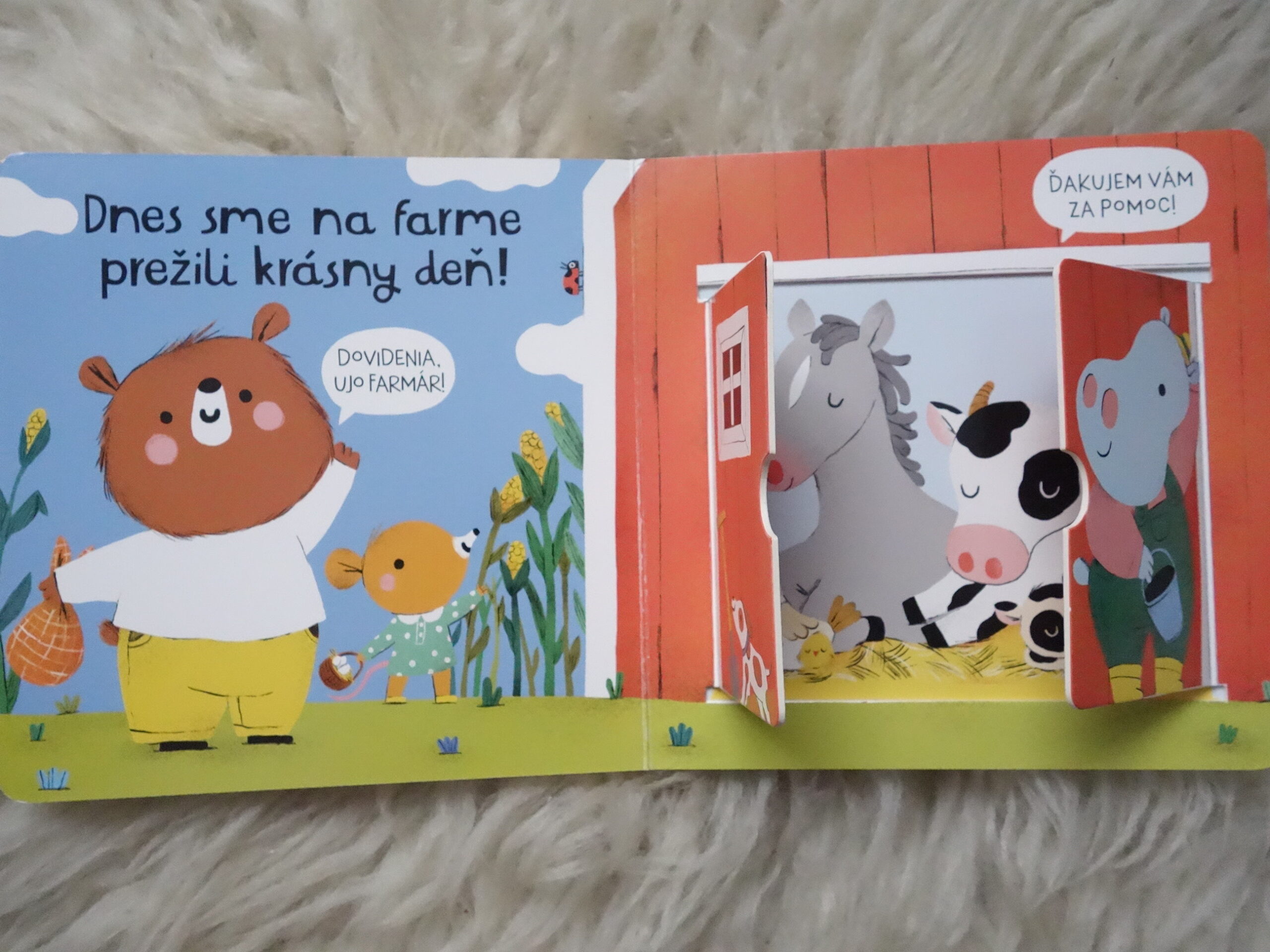 Detské leporelo a mackovi a myške, ktoré spoznávajú zvieratká a ich mláďatká na farme. V knihe sa nachádzajú posuvné prvky a okienka na odkrývanie.