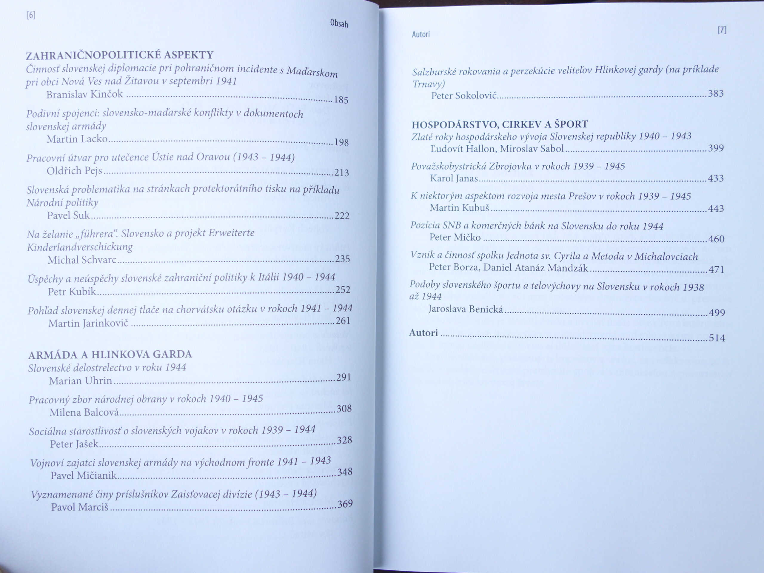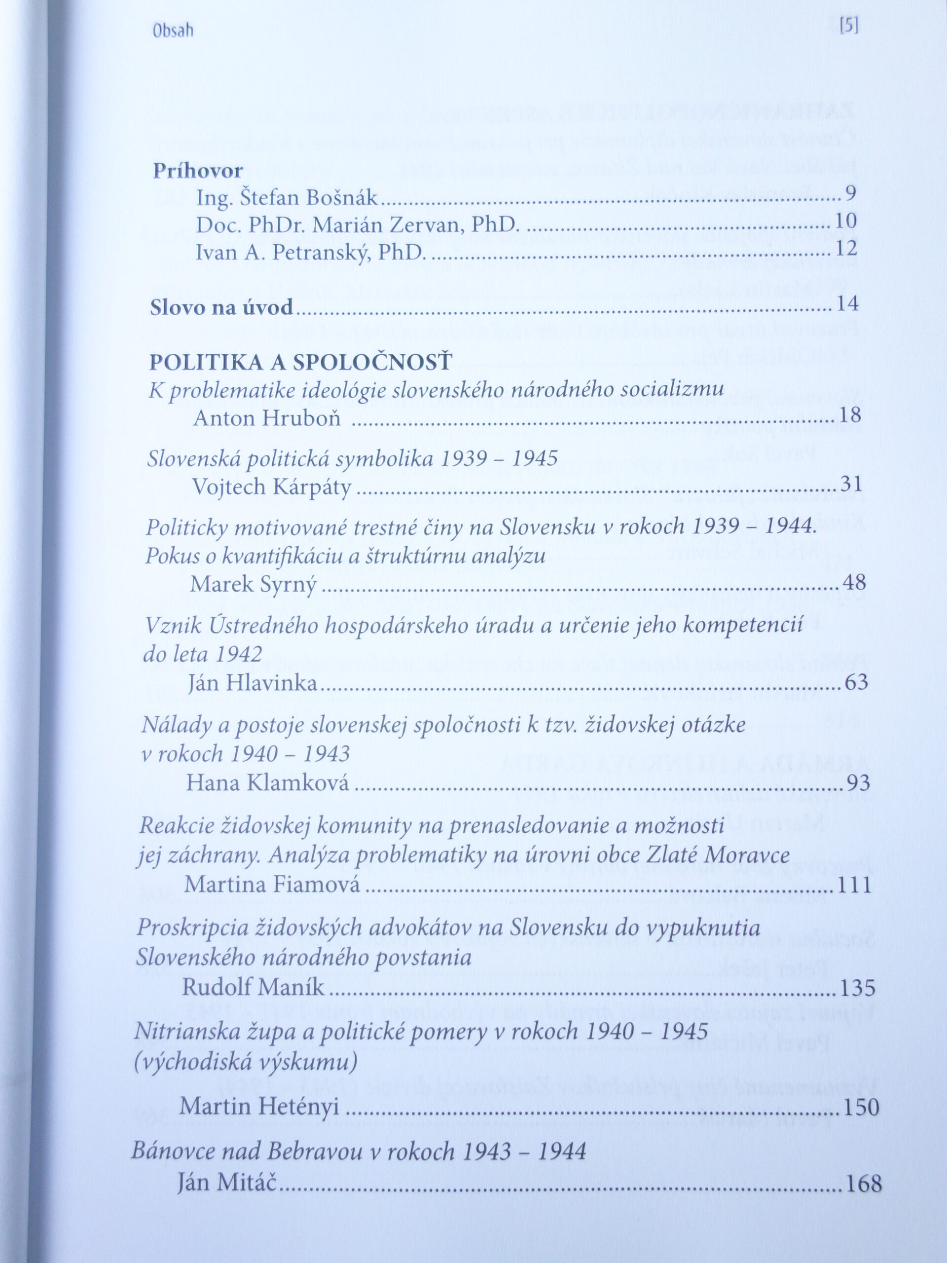 Zborník zachytáva obdobie od salzburských rokovaní v lete 1940 až do vypuknutia povstania na jeseň 1944. Príspevky sú zoradené do štyroch tematických kapitol: Politika a spoločnosť, Zahraničnopolitické aspekty, Armáda a Hlinkova garda, Hospodárstvo, cirkev a šport. Jednotlivé štúdie prinášajú nový pohľad na doteraz nespracované biele miesta v slovenskej historiografii dejín 20. storočia.