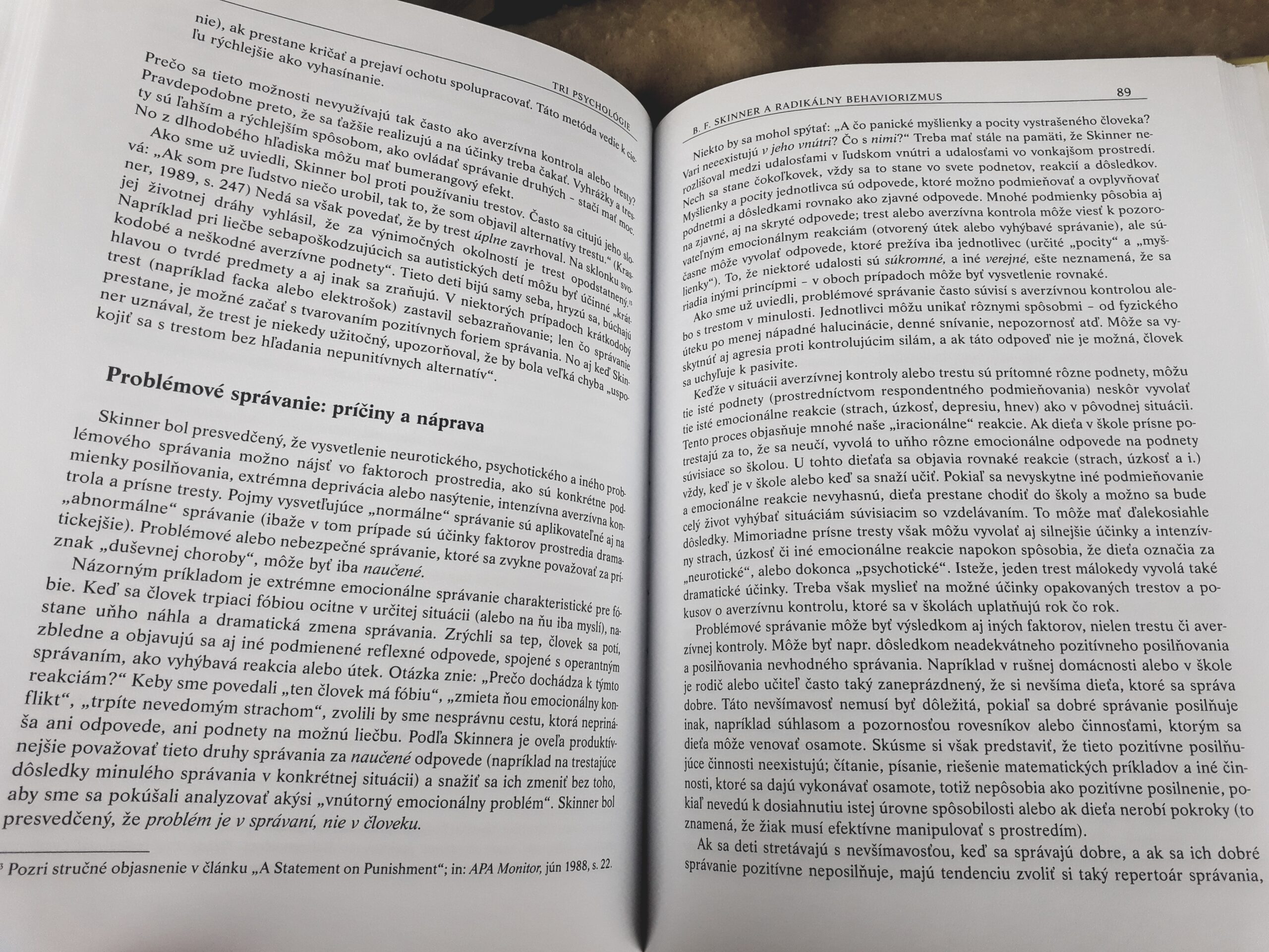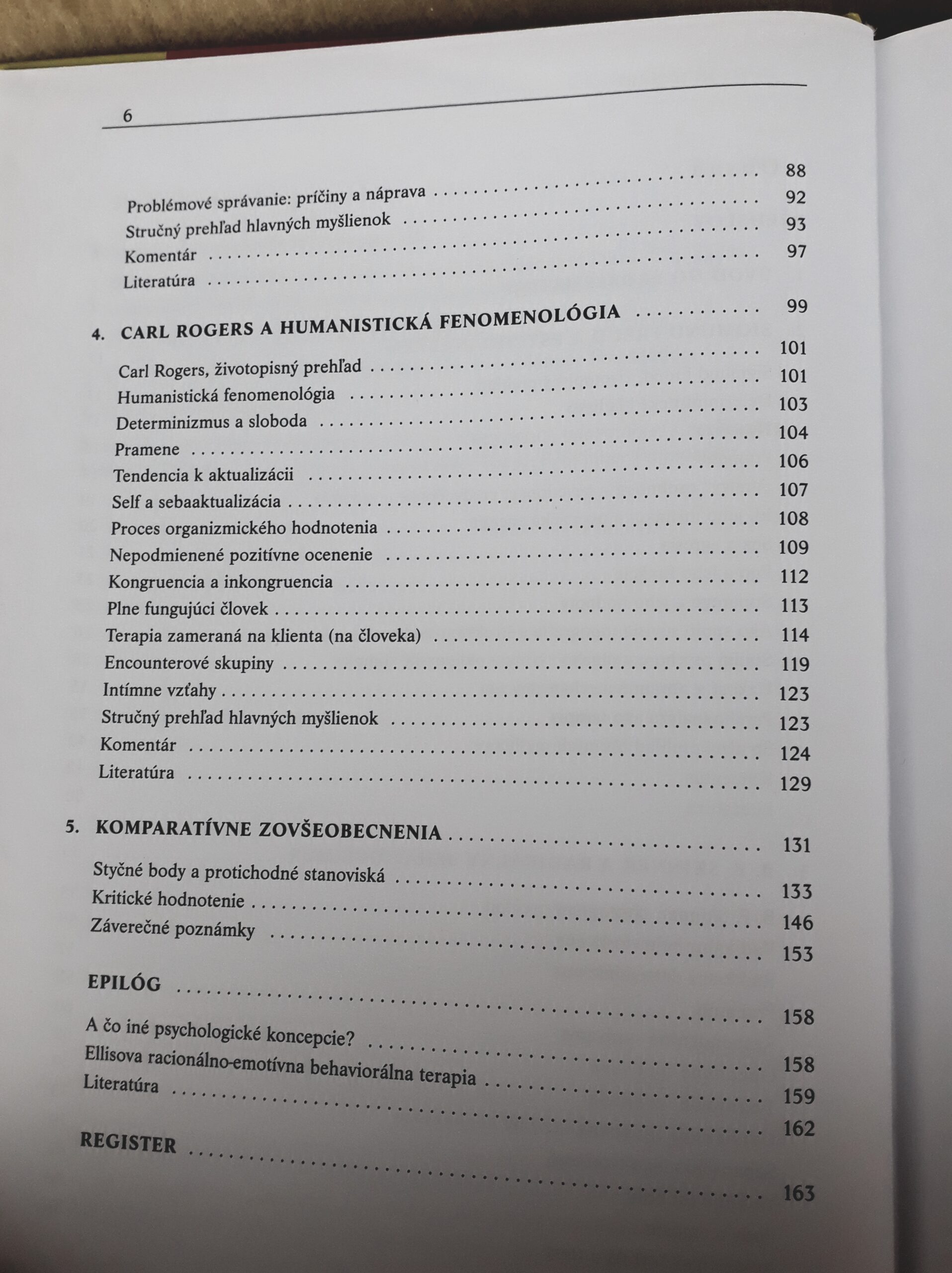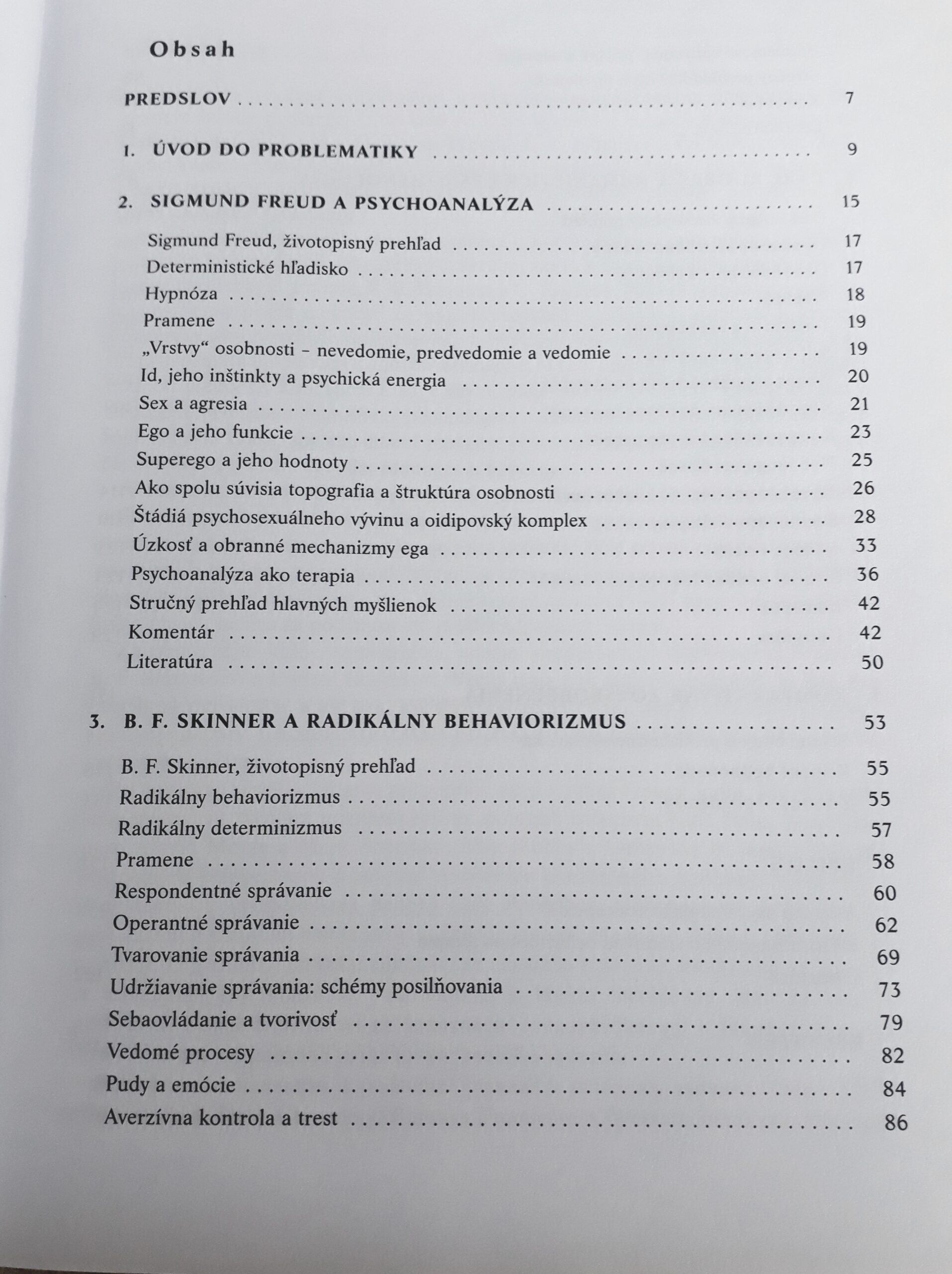Začínajúci študenti v nej nájdu základné informácie, pokročilí získajú potrebný prehľad a kniha nepochybne uspokojí aj laických čitateľov, ktorí sa zaujímajú o rozdielne pohľady na ľudské správanie. Úvodná kapitola prináša stručný prehľad o každej teórii a upozorňuje, v čom sa jednotlivé koncepcie od seba odlišujú. Druhá, tretia a štvrtá kapitola rozoberajú základné myšlienky S. Freuda, B. F. Skinnera a C. Rogersa. Piata kapitola porovnáva a kriticky hodnotí všetky tri koncepcie. Epilóg obsahuje stručné informácie o kognitívnej psychológii a racionálno-emotívnej behaviorálnej terapii Alberta Ellisa……..