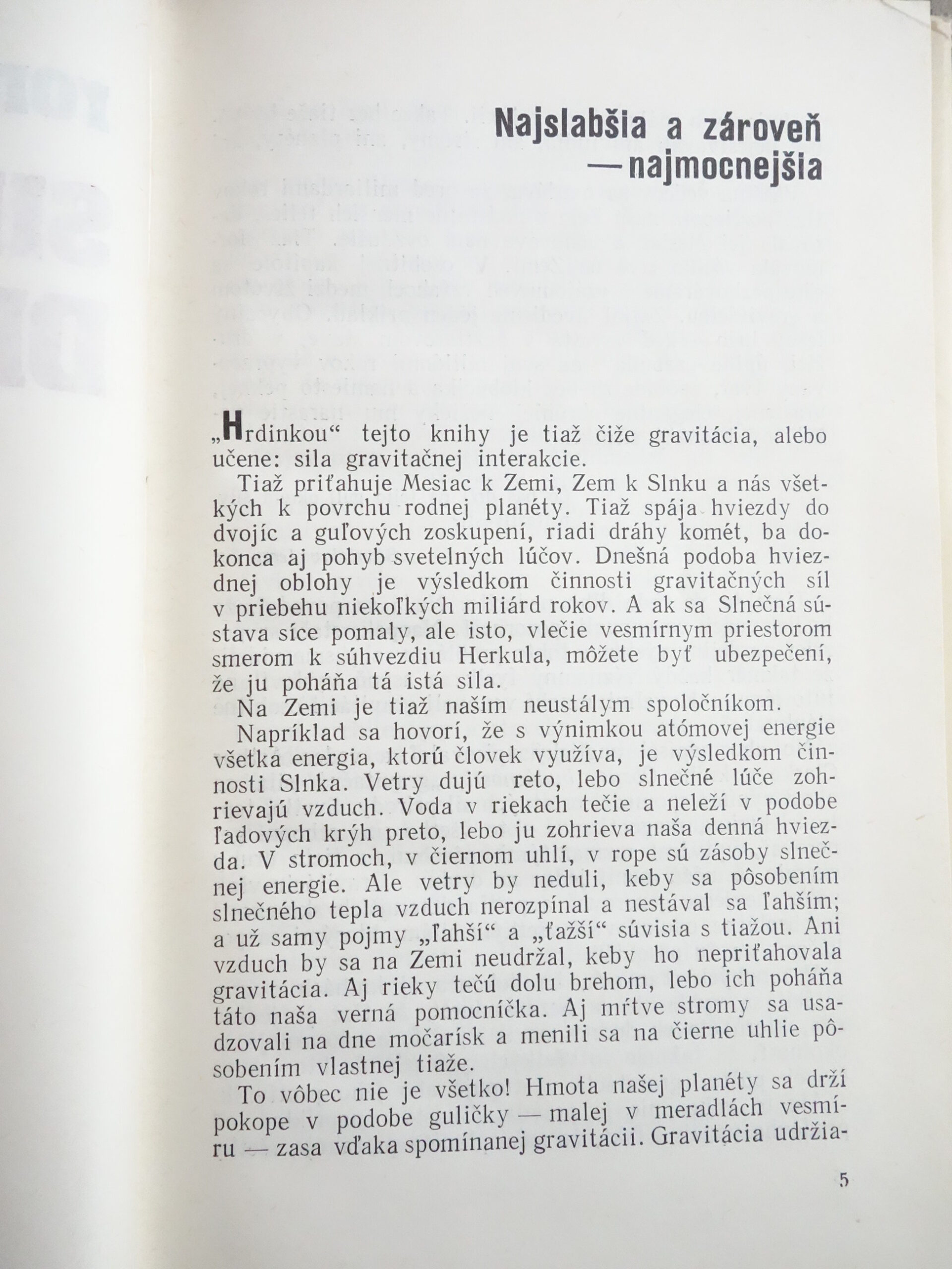 “Už najmenej 2500 rokov sa človek usiluje pochopiť gravitačnú silu, osvojiť si ju a využiť pre seba. Cesta postupného poznávania tejto sily je nesmierne poučná a zaujímavá a ukazuje sa, že tento problém bude kľúčom k tajomstvám výstavby vesmíru, k novému pochopeniu vlastností pohybu, priestoru a času. V závere autor načrtáva závratné perspektívy modernej fyziky.“