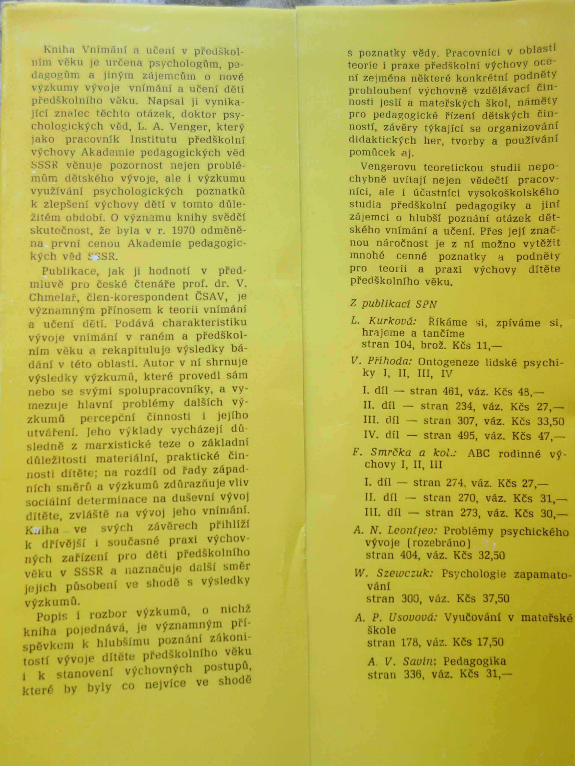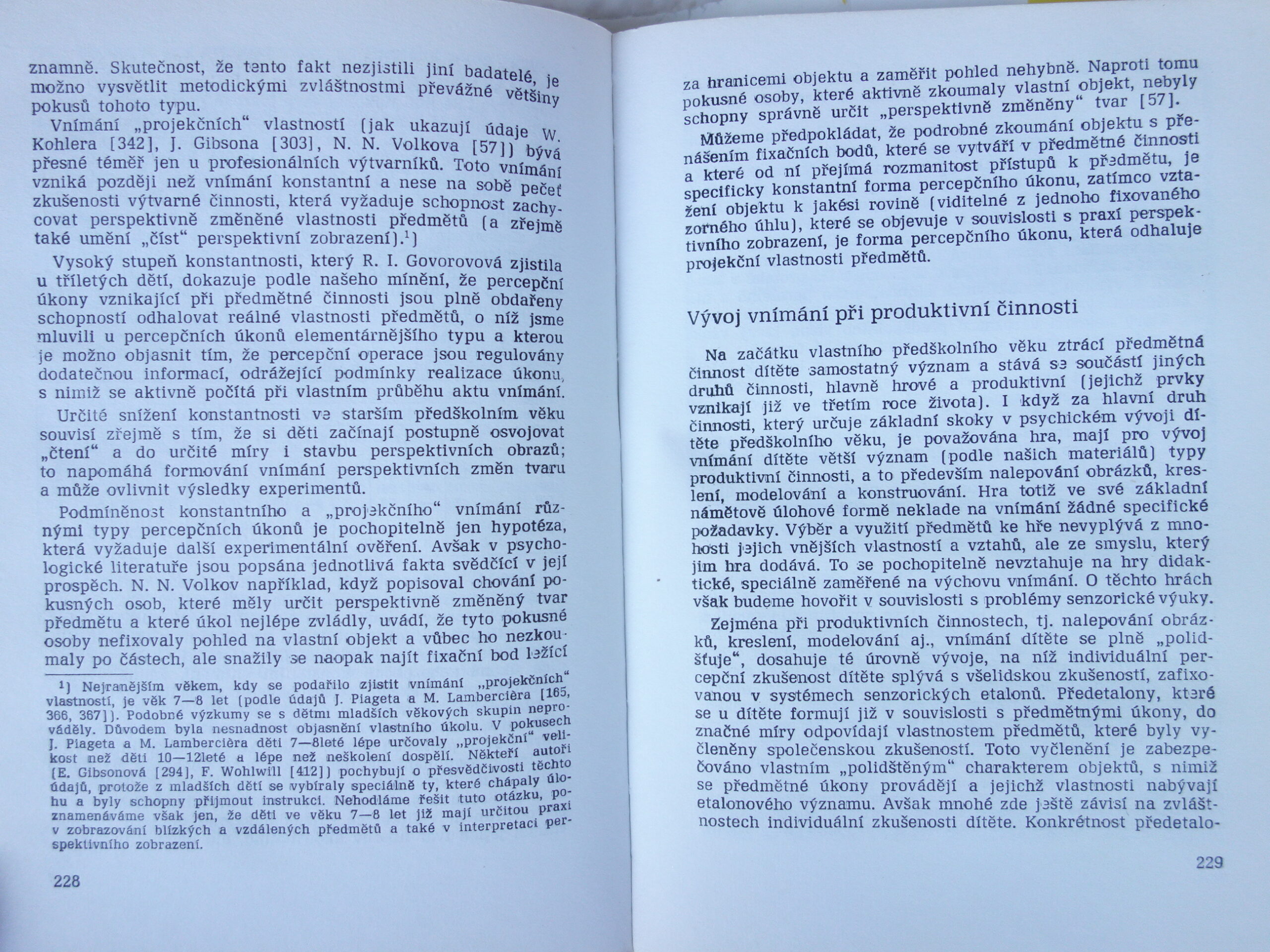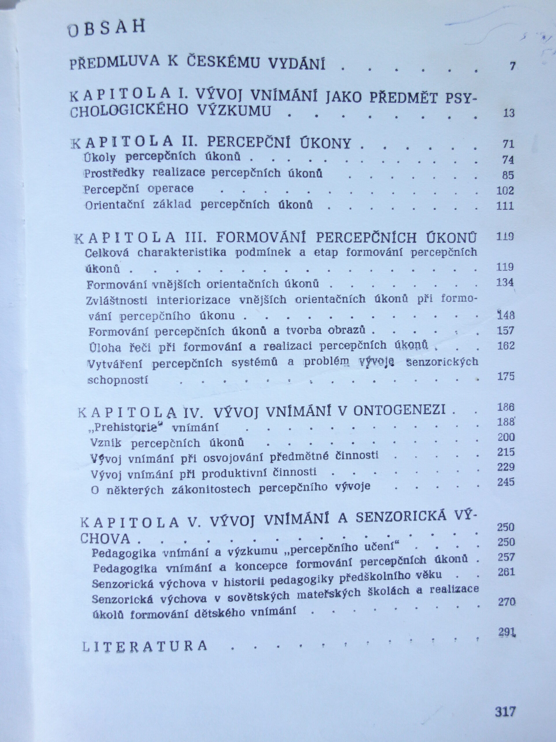Publikácia je významným prínosom k teórii vnímania a učenia detí. Podáva charakteristiku vývoja vnímania v rannom a predškolskom veku a rekapituluje výsledky bádania v tejto oblasti. Autor v nej zhrňuje výsledky výskumov, ktoré urobil sám alebo so svojimi spolupracovníkmi a vymedzuje hlavné problémy ďalších výskumov percepčnej činnosti a jej utvárania.