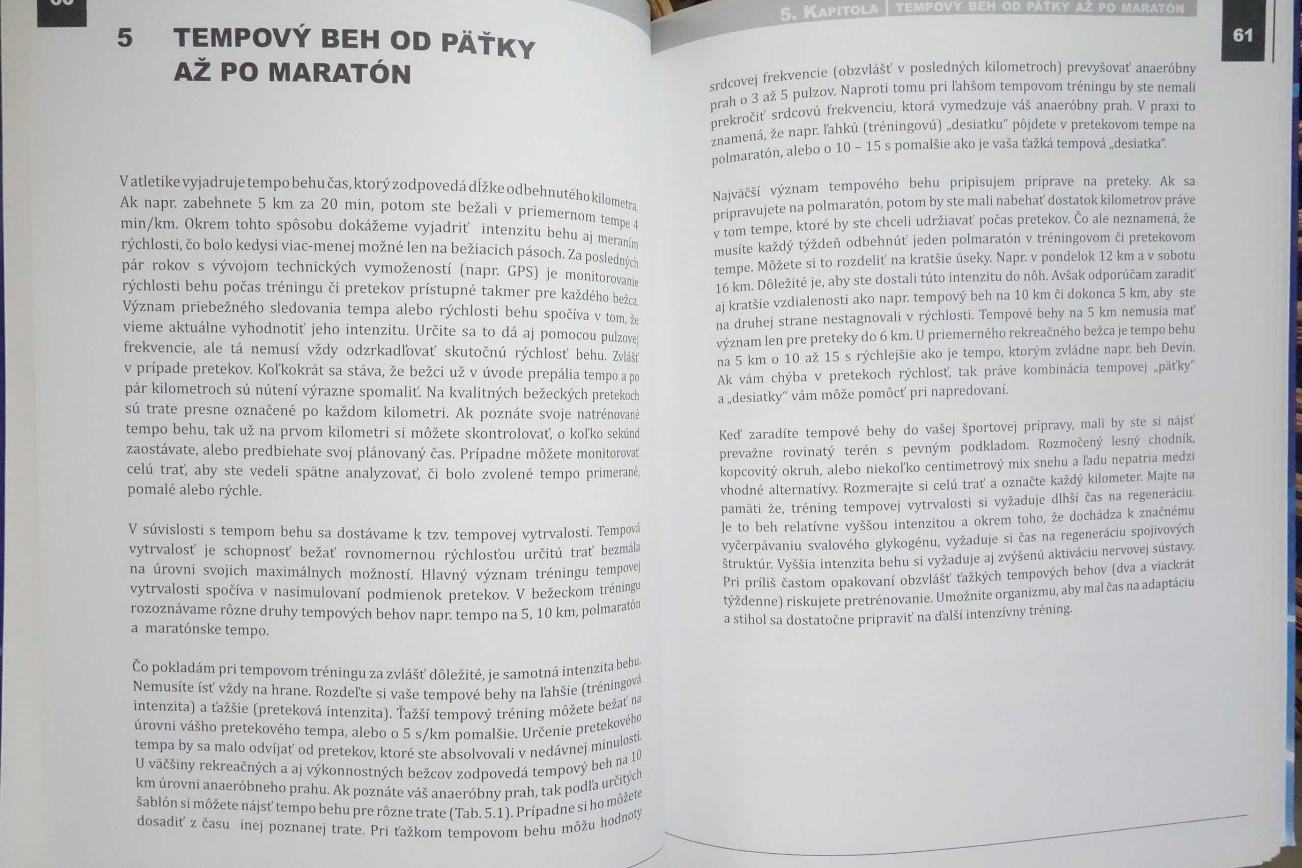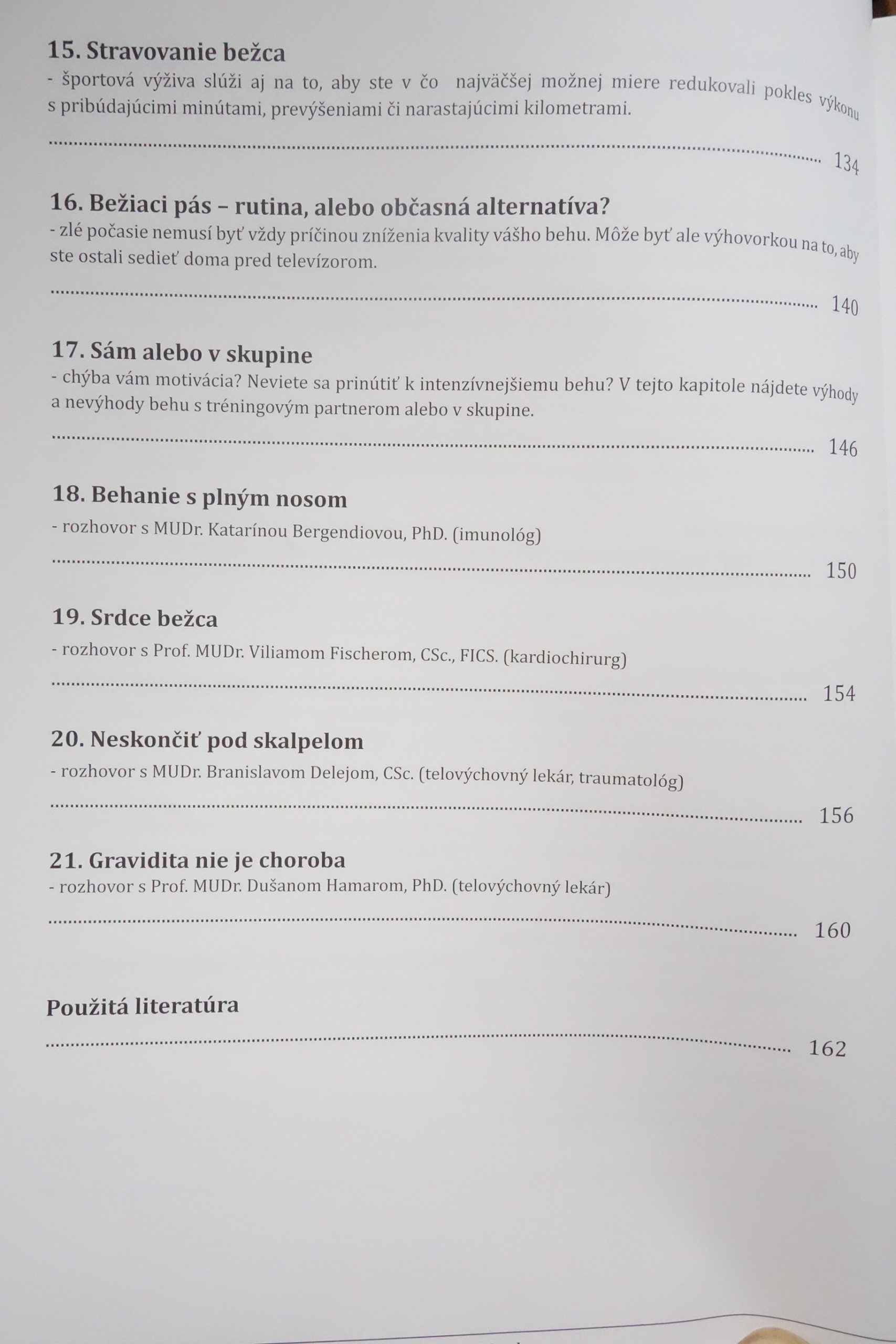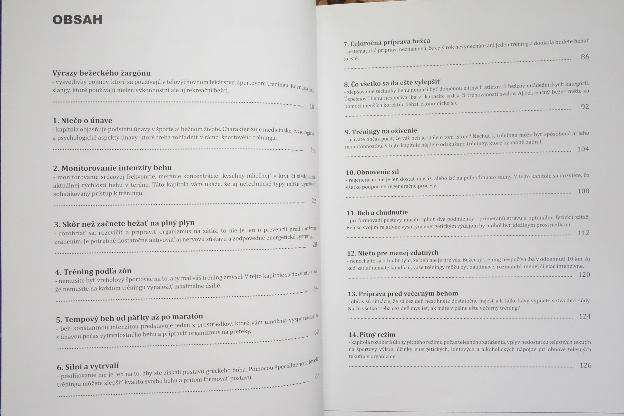 Z knihy sa čitateľ okrem iného dozvie, čo je podstatou únavy v športe aj bežnom živote, ako monitorovať intenzitu behu podľa koncentrácie kyseliny mliečnej v tele, ako vhodne rozohriať organizmus pred tréningom, prečo je dôležité popri behaní aj posilňovanie, aké sú techniky behu, ktoré pomáhajú postupne zvyšovať výkonnosť športovca, ako efektívne obnovovať sily, aký pitný a stravovací režim dodržiavať, či je vhodné trénovať na bežiacom páse alebo keď je žena tehotná.