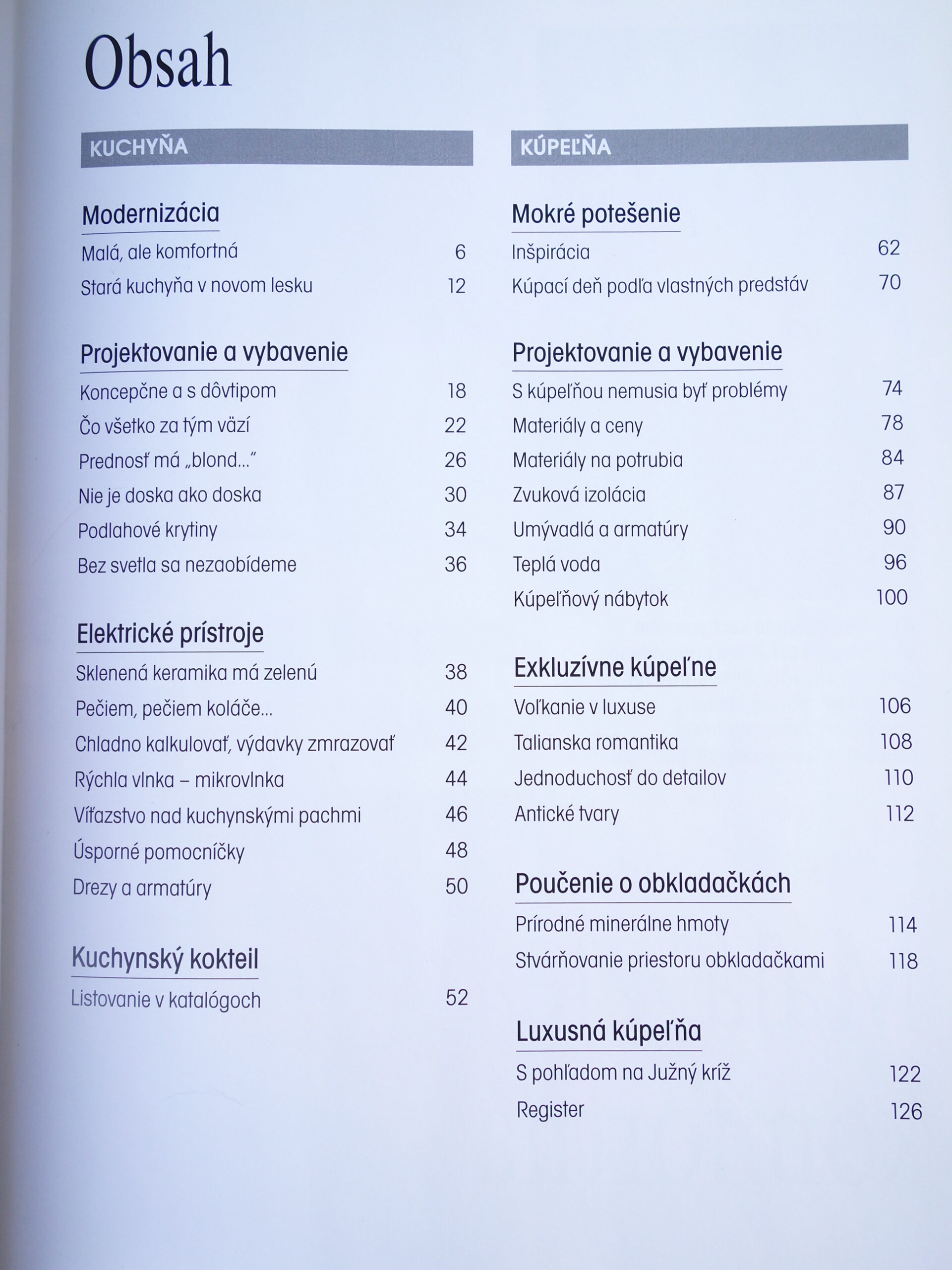 Z obsahu: Kuchyňa (Modernizácia, Projektovanie a vybavenie, Elektrické prístroje, Kuchynský kokteil), Kúpeľňa (Mokré potešenie, Projektovanie a vybavenie, Exkluzívne kúpeľne, Poučenie o obkladačkách, Luxusná kúpeľňa).